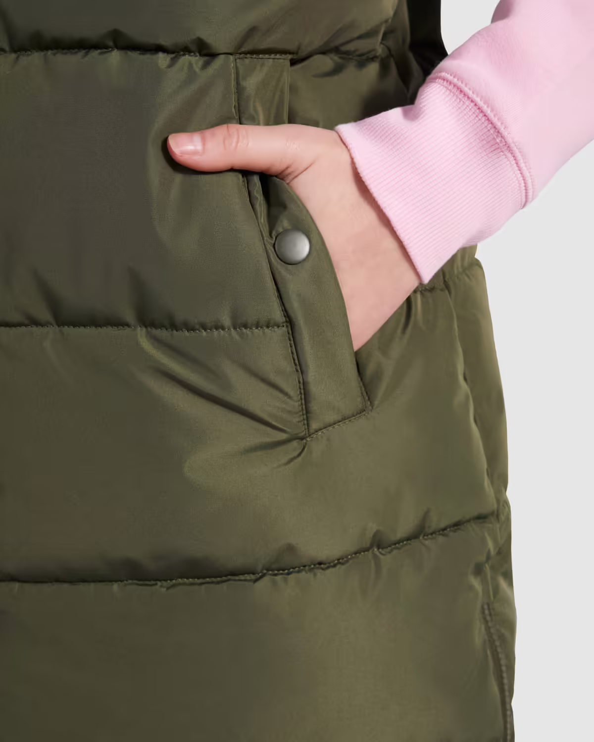 Este chaleco tiene un cuello alto que te protege del frío y le da un toque sofisticado a tu look. El cierre frontal con cremallera oculta bajo una solapa es súper elegante, y los dos bolsillos con cierre de botón son ideales para guardar tus cosas de forma segura. Además, las cremalleras en los laterales te permiten ajustar el chaleco a tu gusto para estar cómoda y tener libertad de movimiento en todo momento.