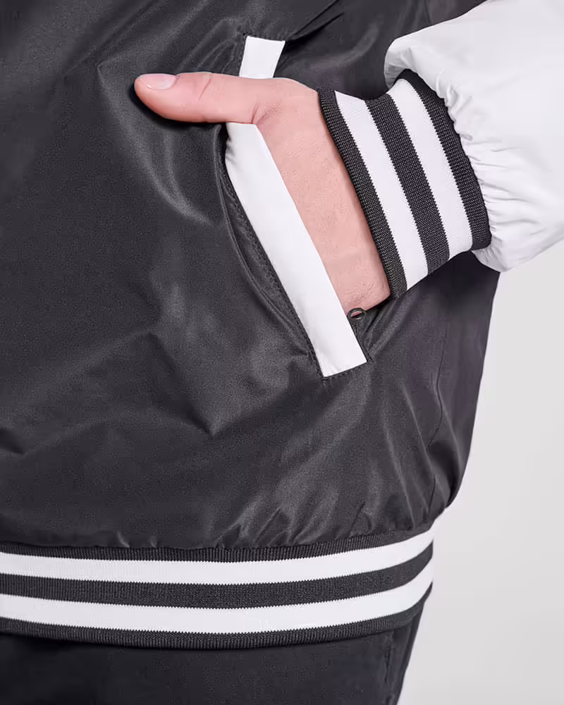 Chaqueta unisex ligeramente acolchada combinada con dos colores. Cuello, puños y bajo en rib 1×1, con dos líneas a contraste. Bolsillos laterales con cremallera. Interior forrado. Botones a presión con acabado de plástico a contraste. Acceso interior en pecho izquierdo y espalda para reprocesos.