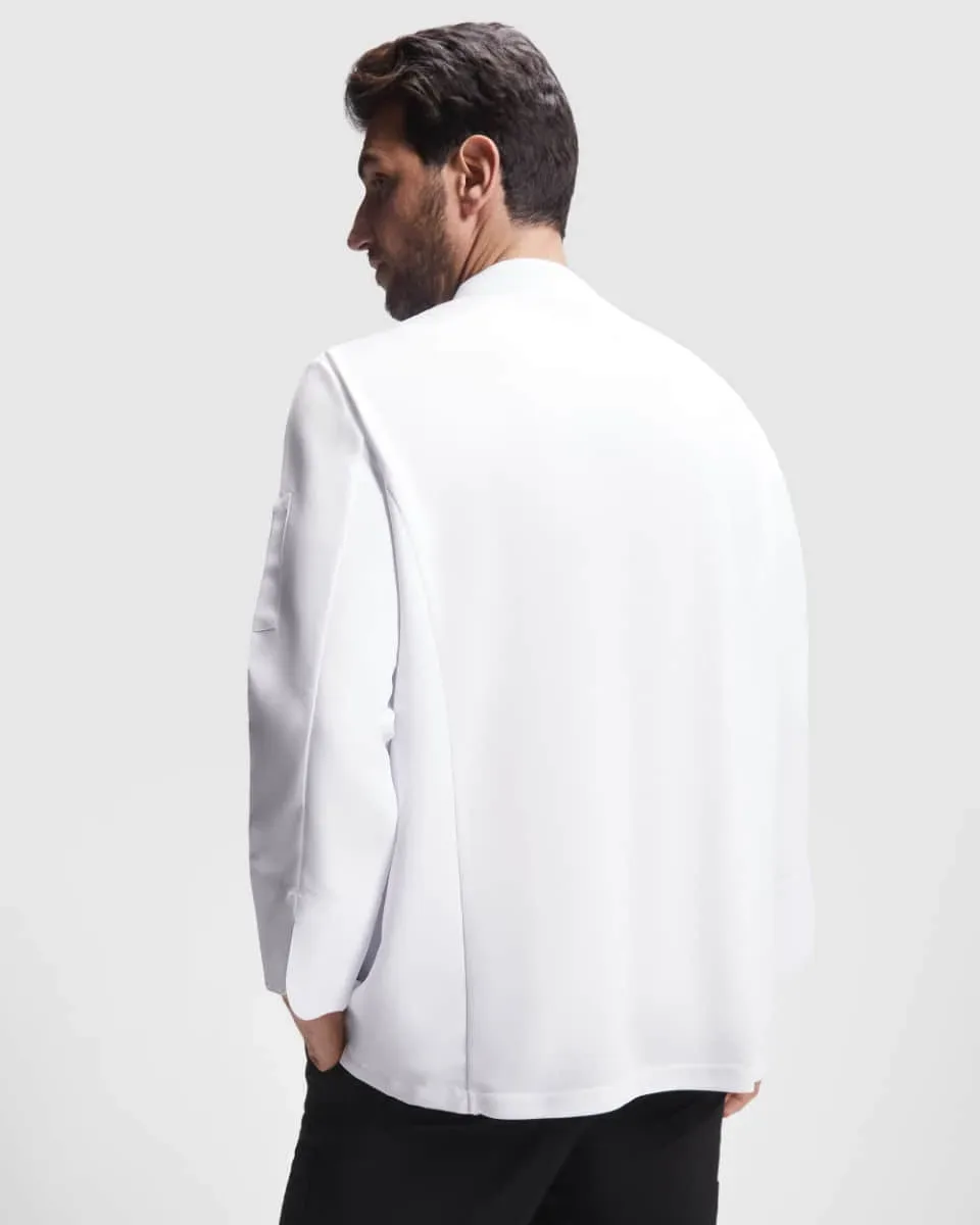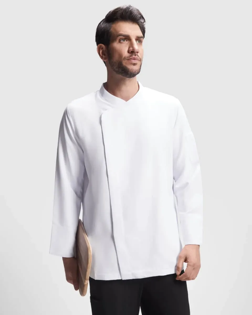 Esta chaqueta de cocinero viene con cierre central cruzado con botones automáticos ocultos, así se consigue que la chaqueta sea tan estilosa como si fuera la capa de un superhéroe, porque si lo piensas bien un cocinero es un poco superhéroe. Para conseguir que las líneas sean rectas, se ha confeccionado el cuello tirilla y manga tipo sastre con dobladillo en puños. Para comodidad del cocinero también lleva un bolsillo de parche en la manga izquierda.