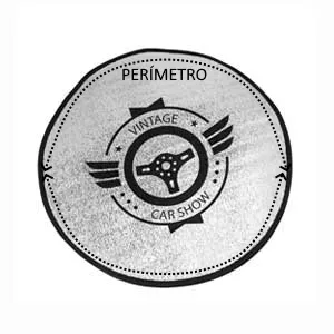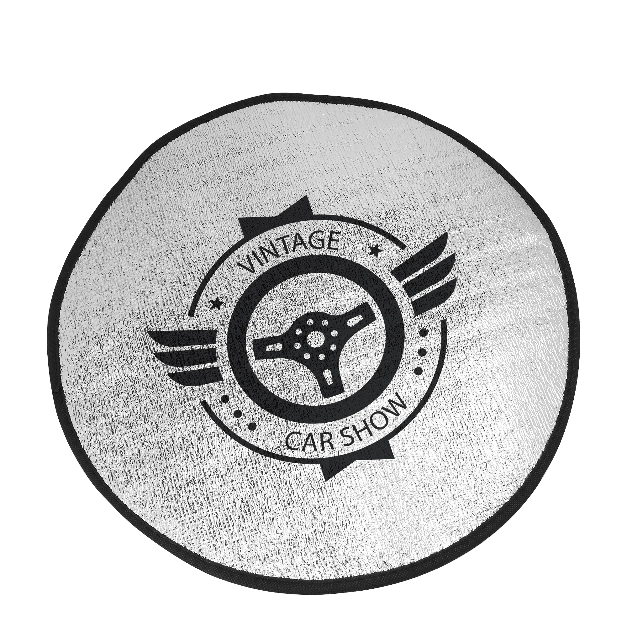 Cubre volante redondo con capa frontal de aluminio y parte trasera de espuma blanca. Ribete en color negro. Presentación en plano.