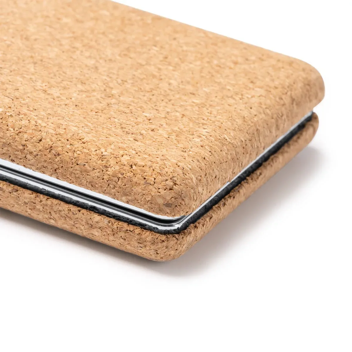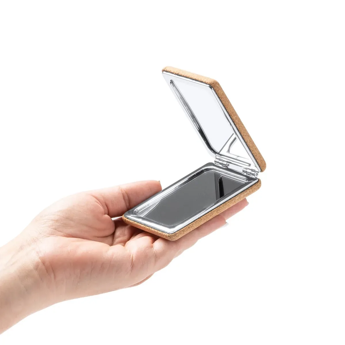 El espejo plegable de bolsillo elaborado en corcho natural con acabados en metal cromado es una opción elegante y sostenible para llevar siempre contigo. Este espejo tiene un diseño cuadrado y compacto, perfecto para caber en bolsos, bolsillos o neceseres.