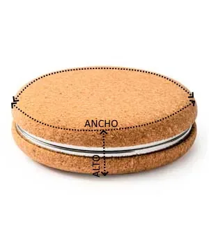 Espejo plegable de bolsillo realizado en corcho natural y metal cromado, compuesto por dos espejos, uno normal y otro de aumento.