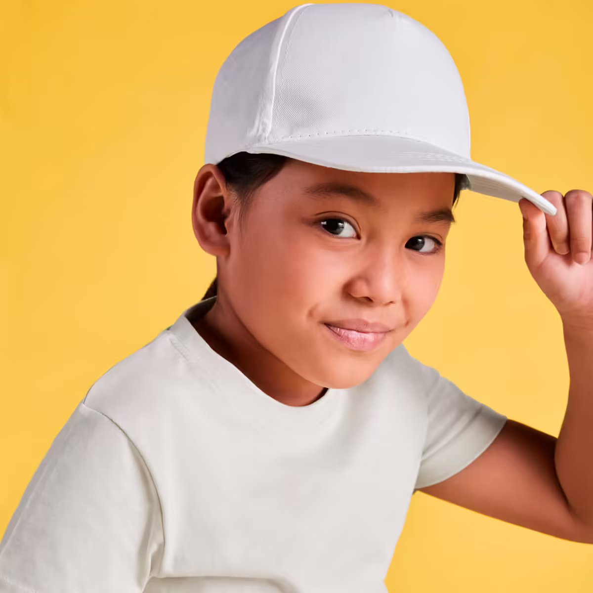 Y, claro, como te imaginarás, nosotros te recomendamos la gorra de cinco paneles Roly Uranus para niño.