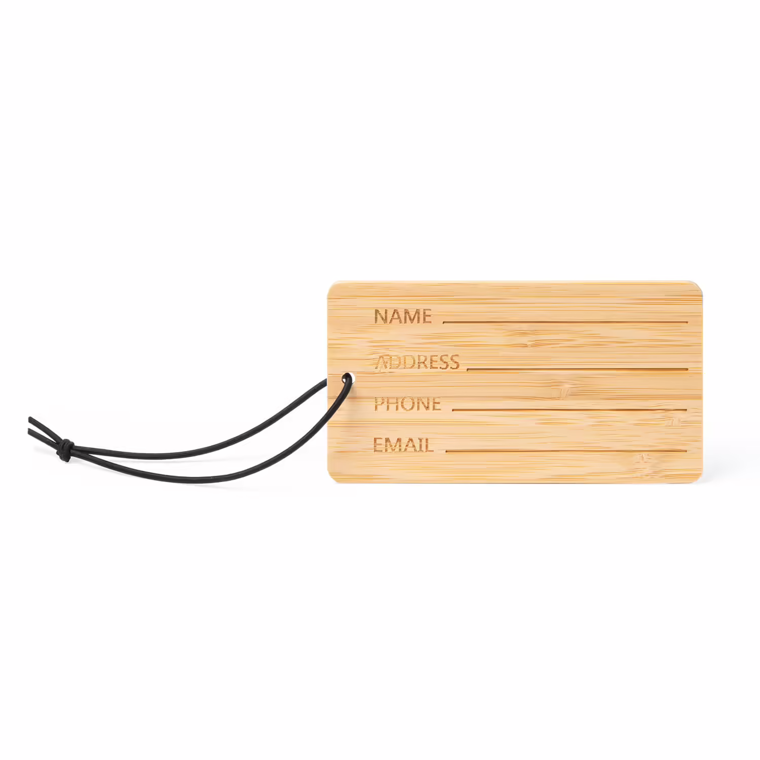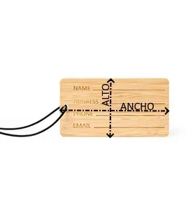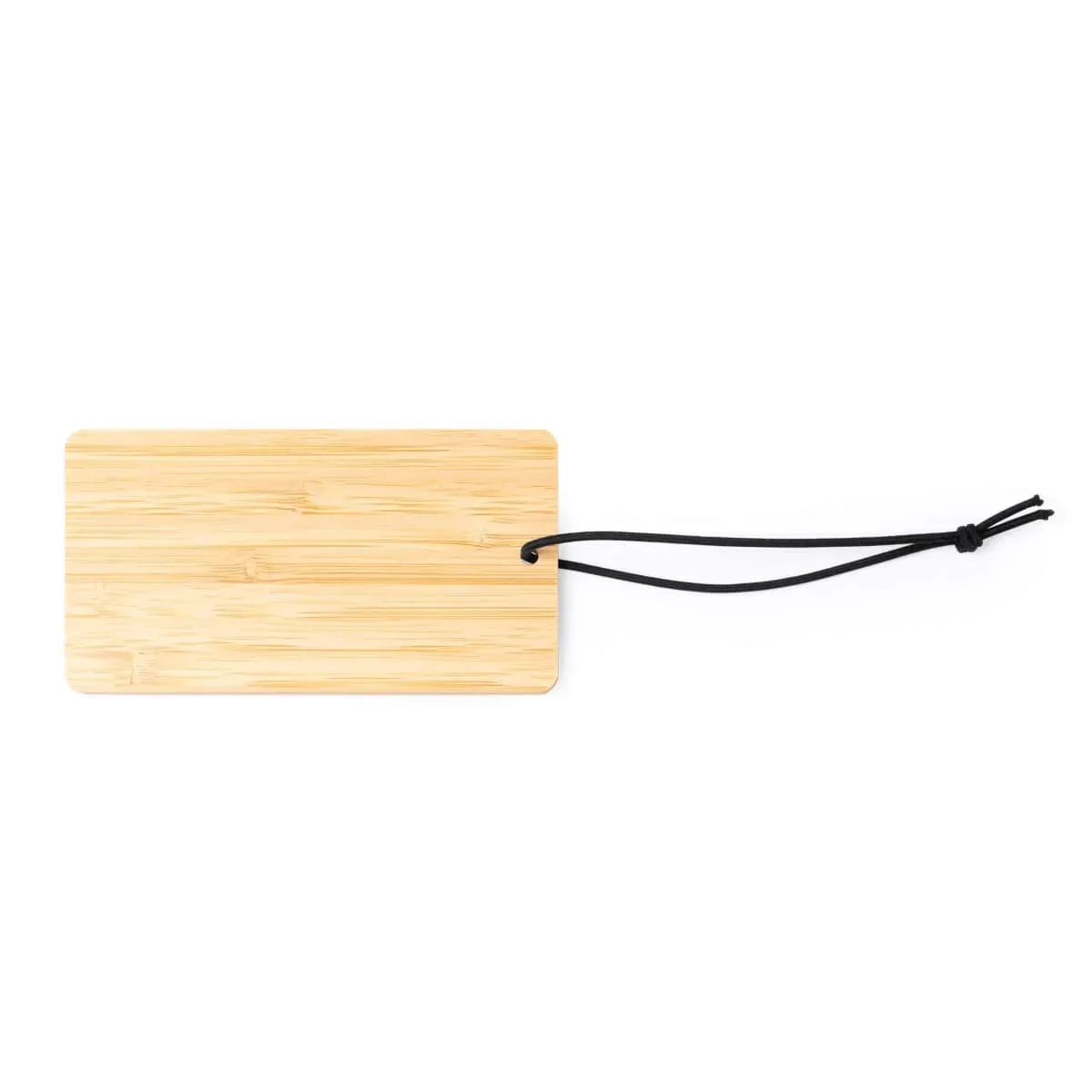 Identificador de maletas de bambú. Con banda elástica en color negro.