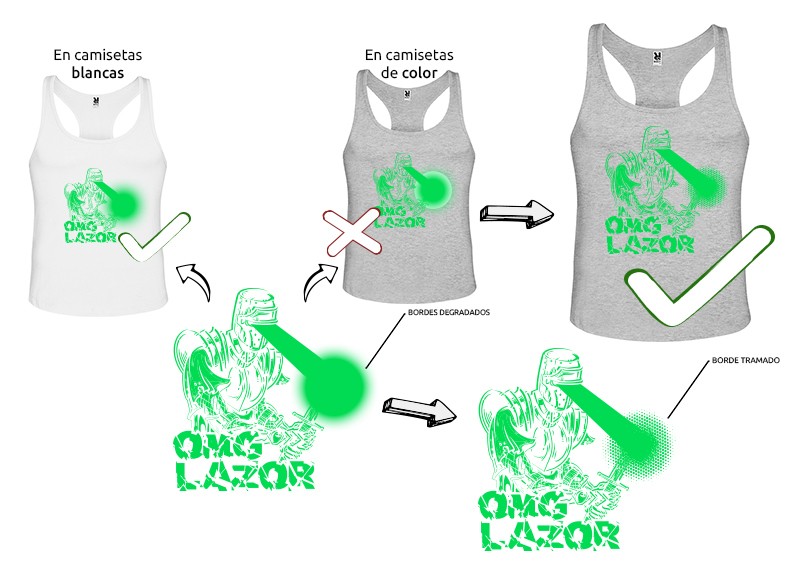 El principal motivo de corrección de los bordes es que en el caso de degradados en camisetas blancas no se nota pero en las de color, a la hora de estampar el diseño puede dar como resultado un halo blanco alrededor del diseño. Esto sucede por la base previa que se le da al tejido de un producto de color blanco que hace más duradera la adherencia del estampado en la camiseta. Cuando los puntos de color a estampar tienden al transparente, como sucede en los bordes degradados, el color deja ver lo que hay por debajo que no es más que el tintado base de las estampaciones. Para solucionarlo, lo conveniente es tramar los bordes para que así el efecto de degradado se consiga impidiendo que se vea el molesto producto de base.
