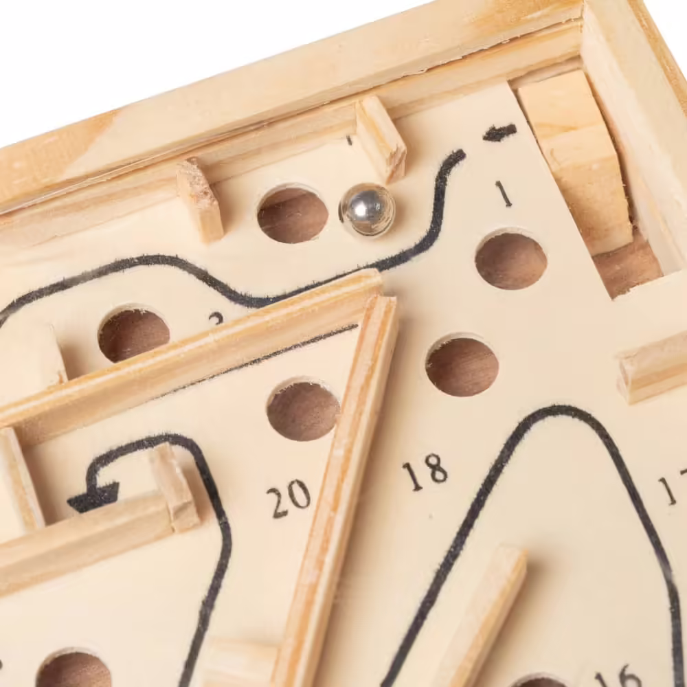 Juego de habilidad fabricado en madera, diseñado para poner a prueba tu destreza y concentración en un laberinto de 20 obstáculos.