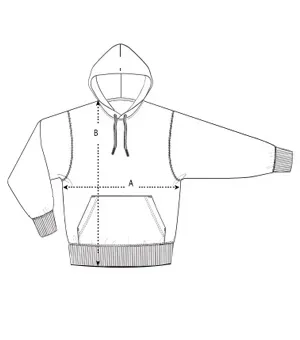Manga pegada Capucha forrada en tejido principal Cordón plano en el mismo tono rematado con puntas de acabado metálico Ojales metálicos Bies interior posterior de espiga en el cuello Media luna interior en tejido principal Puntada simple en cuello Canalé 2×2 en puños y bajo Puntada doble en sisa, puños y bajo Bolsillo canguro