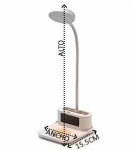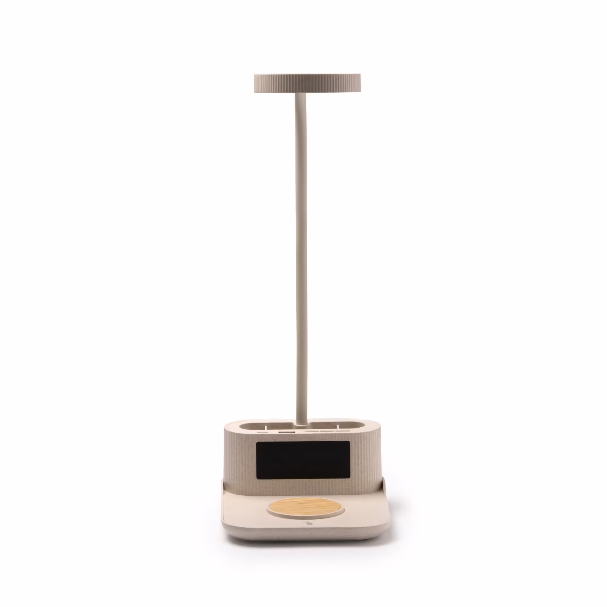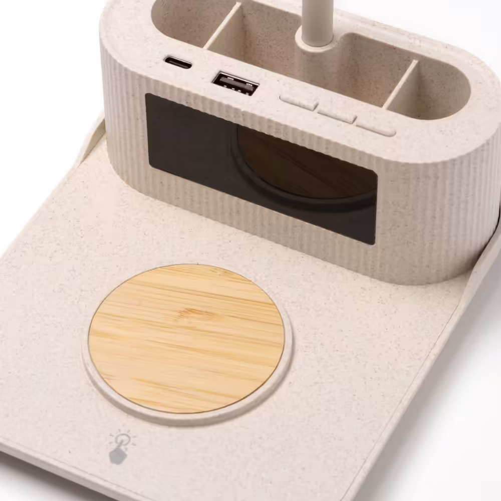 Lámpara cargador multifunción, fabricada en fibra de trigo y bambú, combina sostenibilidad y tecnología. Incluye un reloj con alarma y un lapicero, ofreciendo organización y practicidad. Su lámpara presenta tres niveles de intensidad de luz para adaptarse a diversas necesidades. Además, cuenta con un cargador inalámbrico de 15W, un puerto USB con salida Tipo C y un puerto USB estándar, proporcionando múltiples opciones de carga para dispositivos electrónicos.