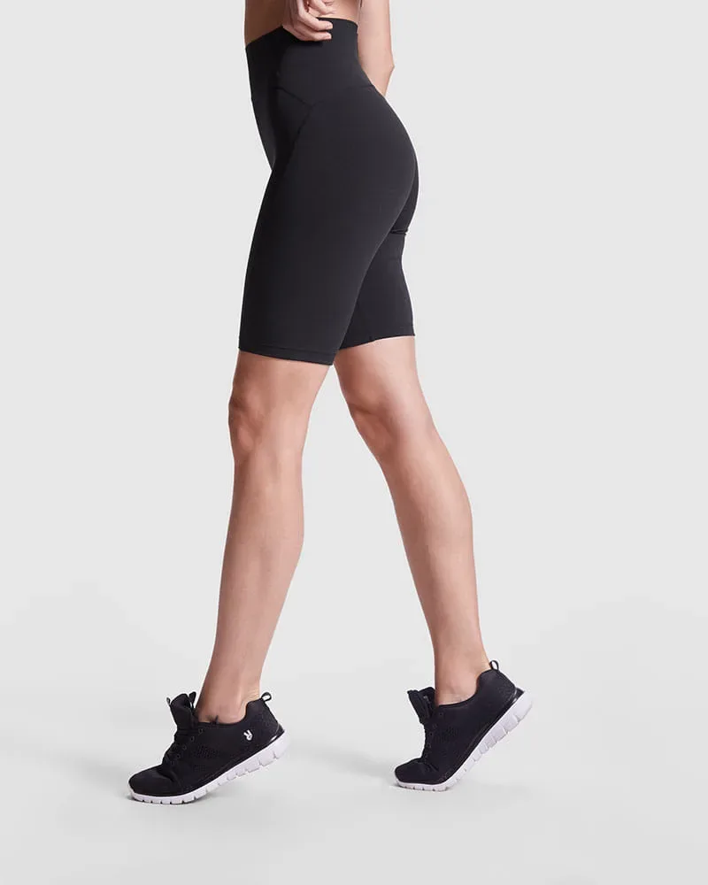 Leggings cortos compresores realizado en poliéster reciclado. Cintura alta siliconada para un mejor ajuste al cuerpo. Acabados en corte laser en cintura. Costuras anti roce en toda la prenda. Confeccionada en piezas para un ajuste perfecto al cuerpo.