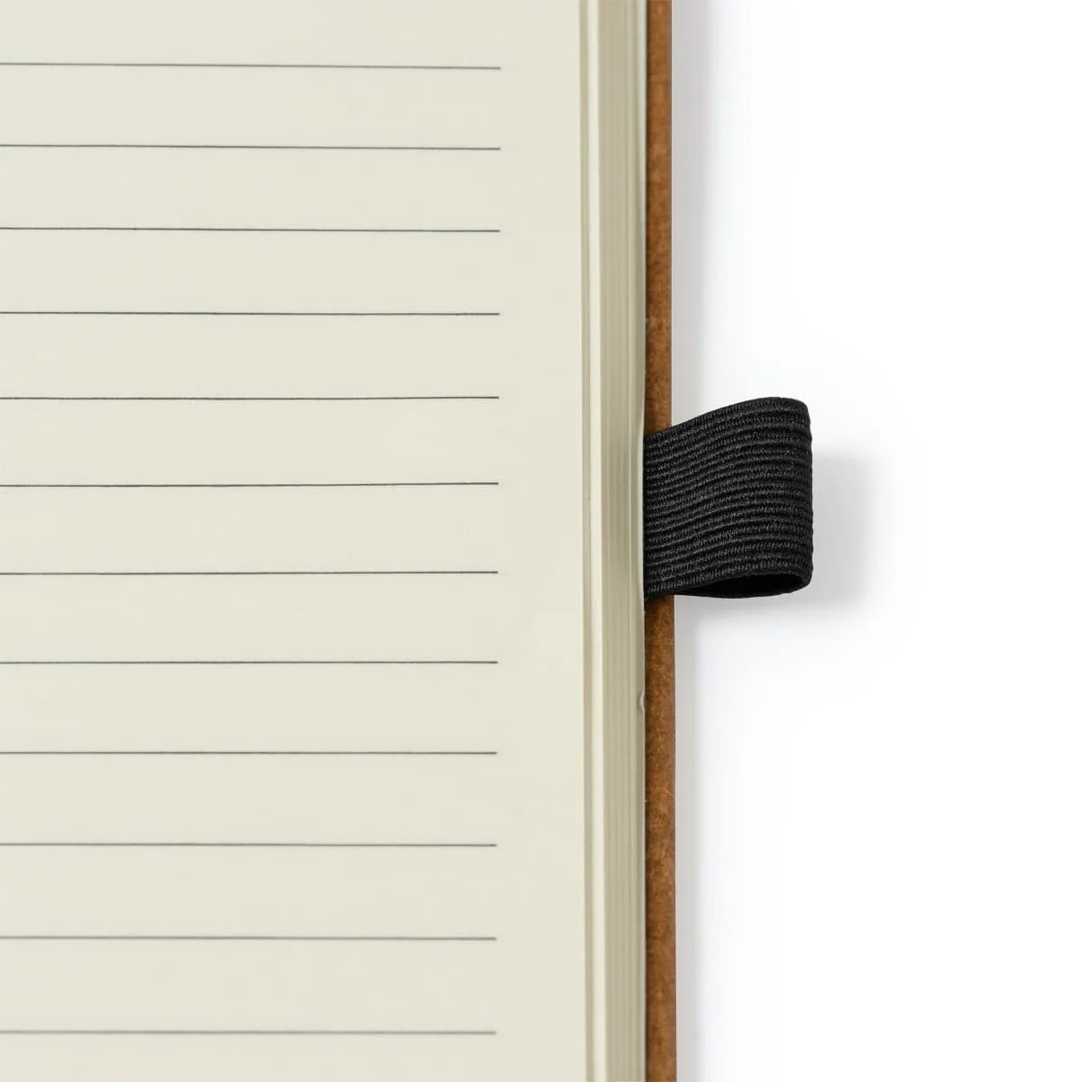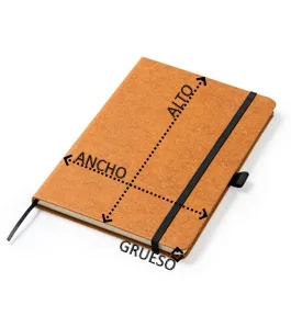 Bloc de notas A5 con tapa rígida elaborada con cuero reciclado. Marcapáginas y banda elástica de cierre. Cuenta con 100 hojas a una línea.