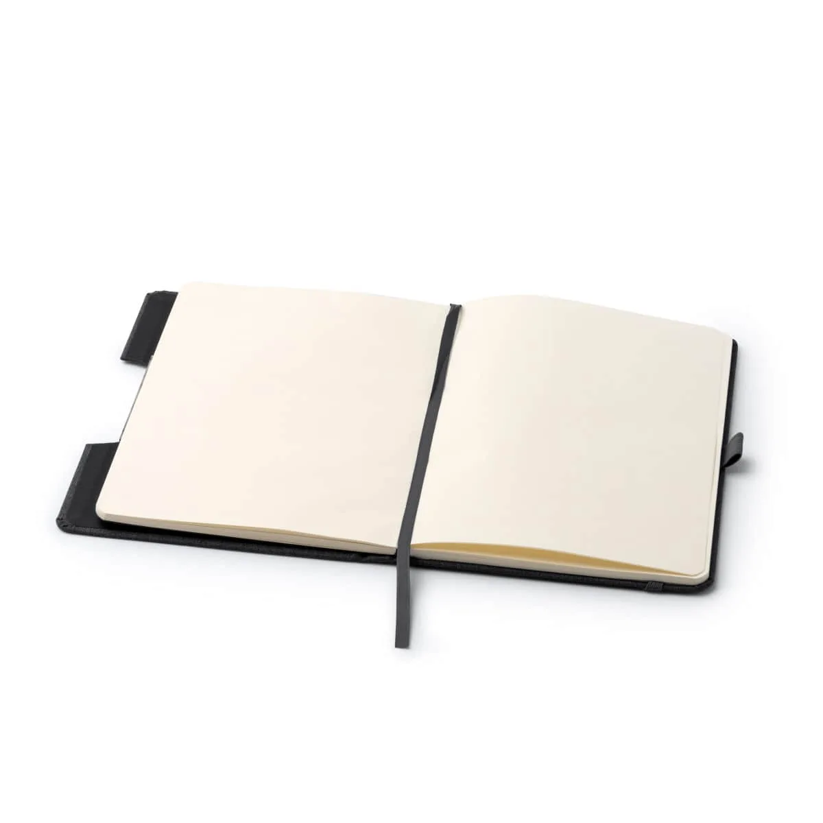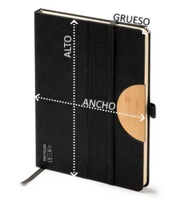 Bloc de notas A5 con tapa rígida de RPET con función soporte. Banda elástica de cierre, marcapáginas y soporte para bolígrafo. Este bloc cuenta con 80 hojas.