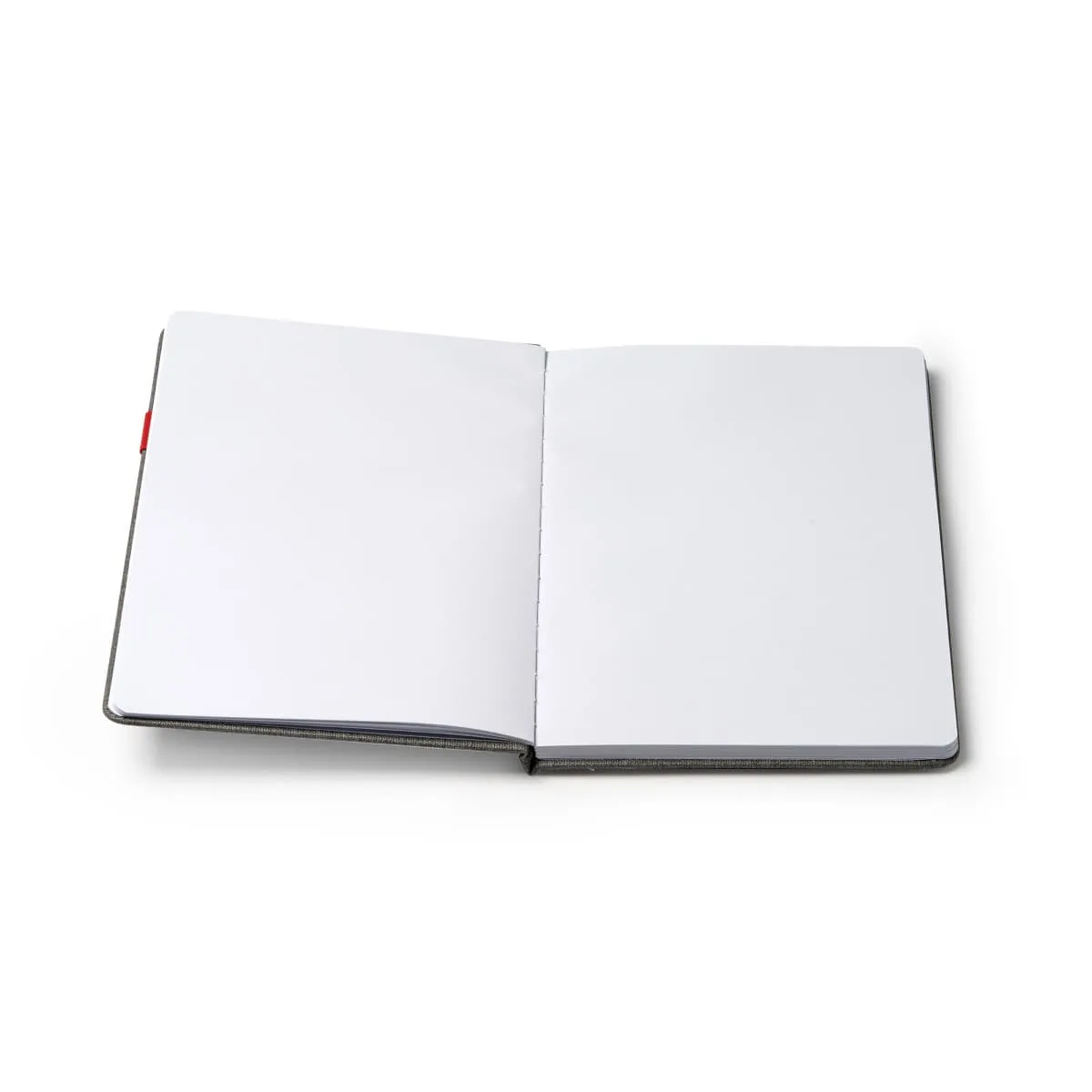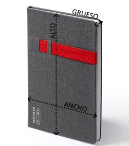 PRODUCTO QUE SE DESCATALOGARÁ CUANDO SE AGOTEN LAS EXISTENCIAS – Bloc de notas A5 con tapa rígida de RPET. Incluye soporte para bolígrafo y móvil. Cuentan con 80 hojas lisas.