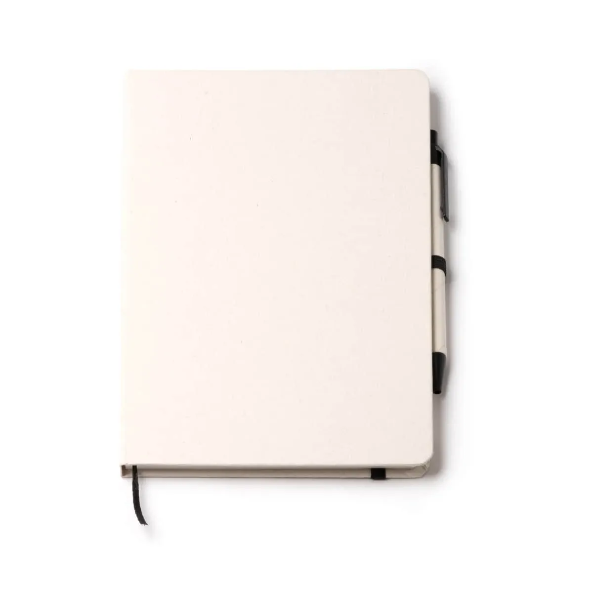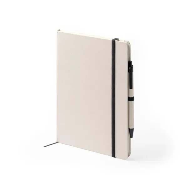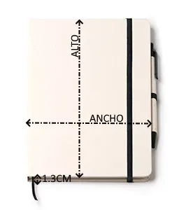 Bloc de notas A5 realizado en cartón reciclado de brics de leche. Tapa rigida con banda elástica y marca páginas. Incluye bolígrafo de tinta azul. 100 hojas a rayas.