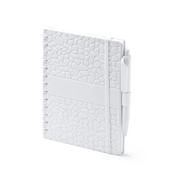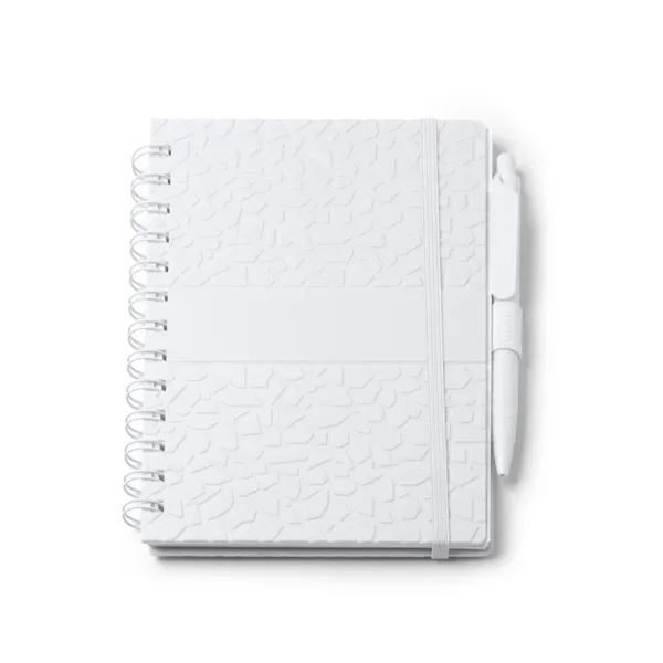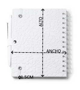 Libreta A5 realizada a base de estractos de piedra. Tapa rígida y doble anilla. Soporte con bolígrafo a juego. Tinta azul. 70 hojas a rayas.