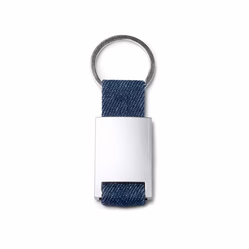 Llavero realizado en tejido vaquero con cuerpo metálico.
