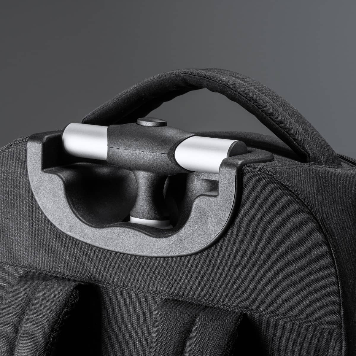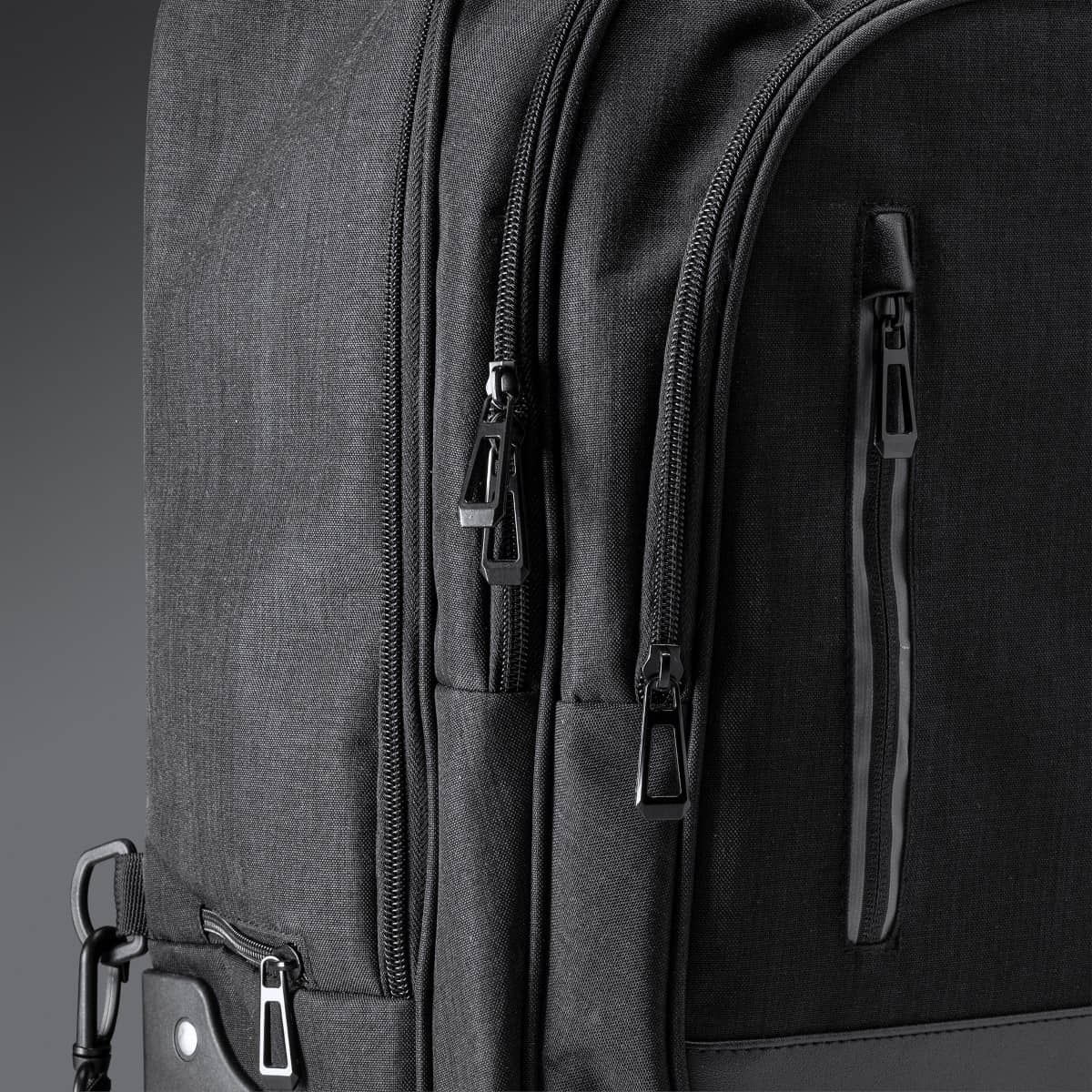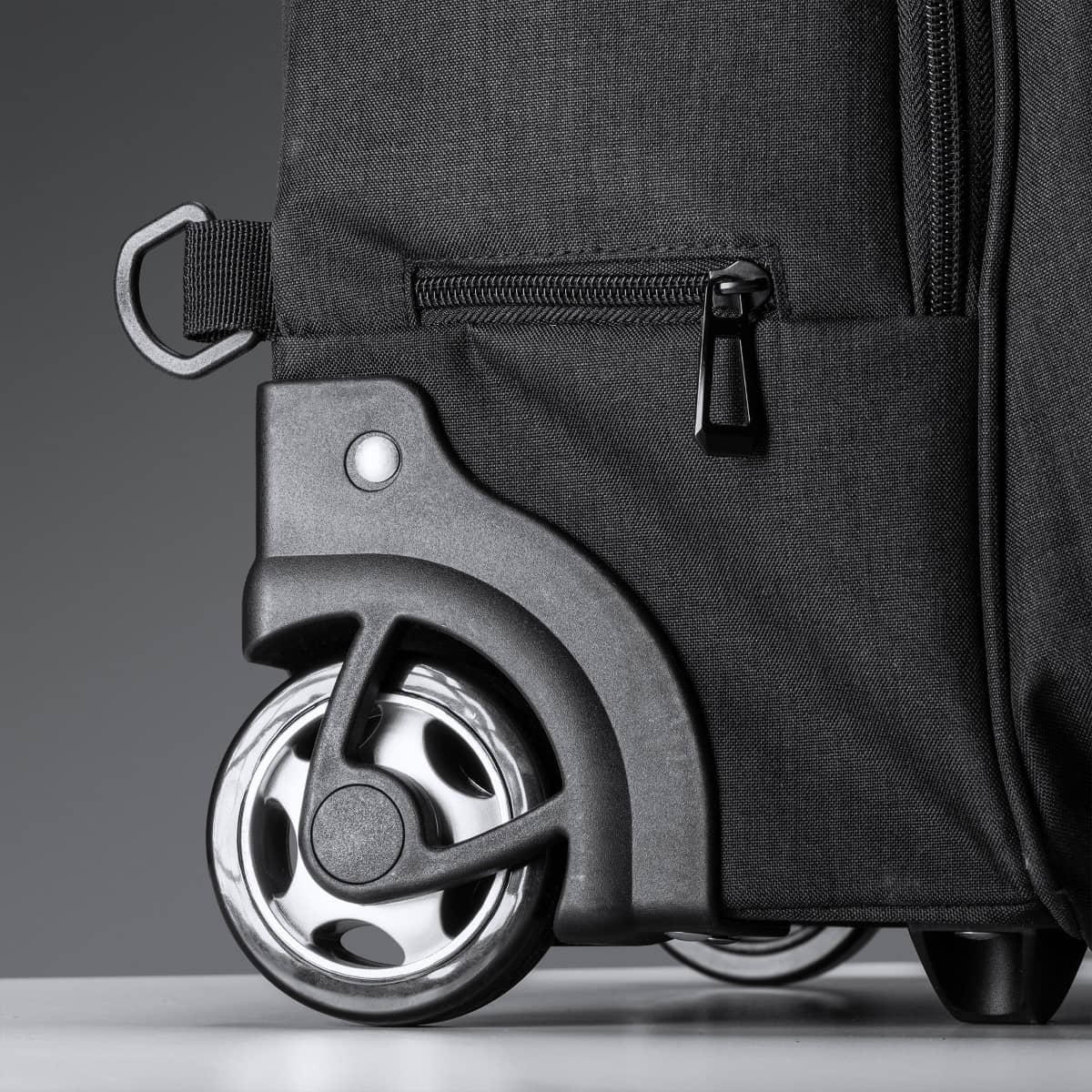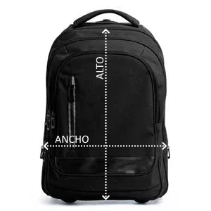 Trolley convertible en mochila. Realizado en poliéster 300D vigoré. Bolsillo principal de gran capacidad con compartimento interior acolchado ideal para portátil de hasta 15″. Dos bolsillos con compartimentos interiores y bolsillo frontal. Estructura de alta calidad y resistencia. Tiras acolchadas ajustables. Fundas cubre ruedas antimanchas.