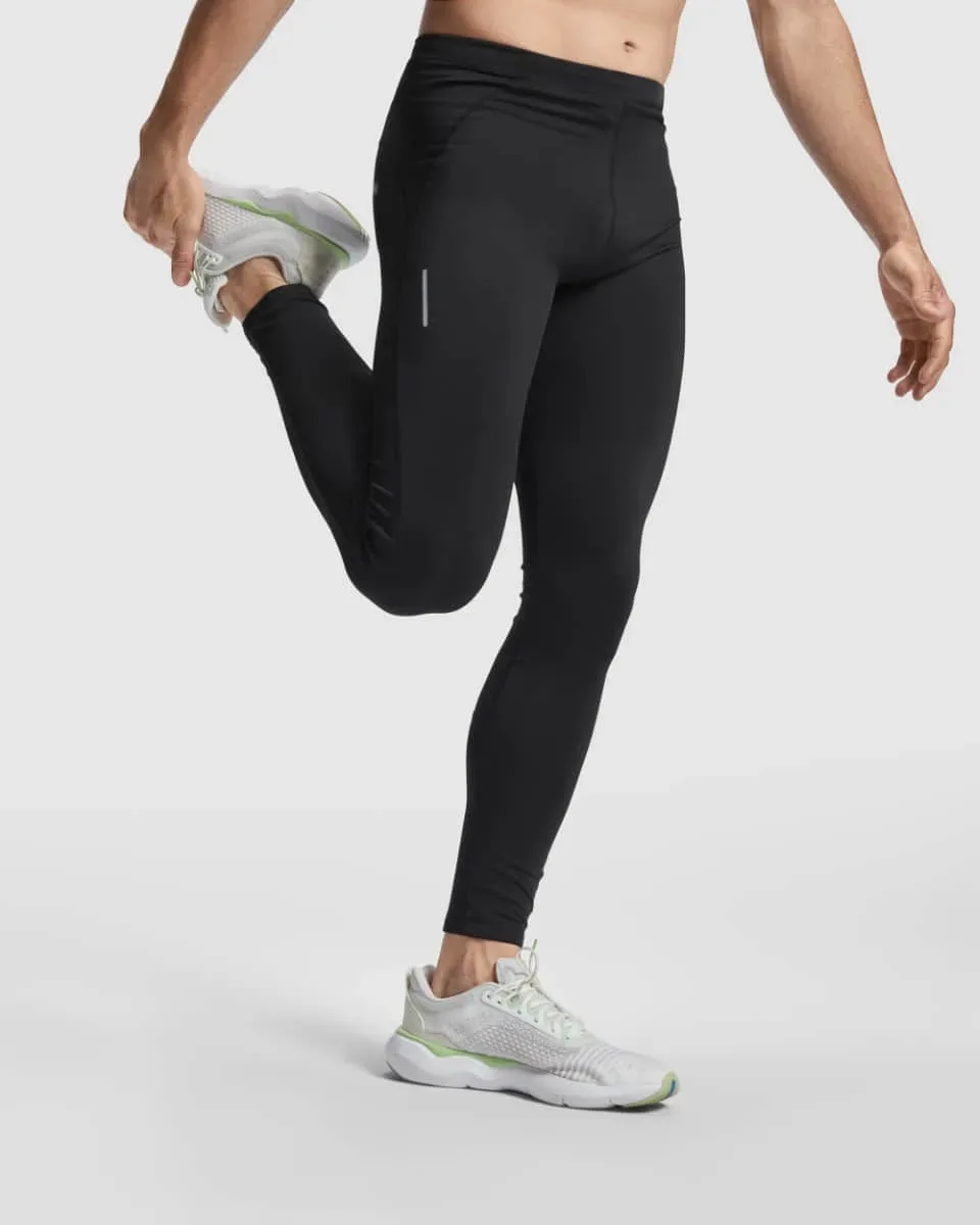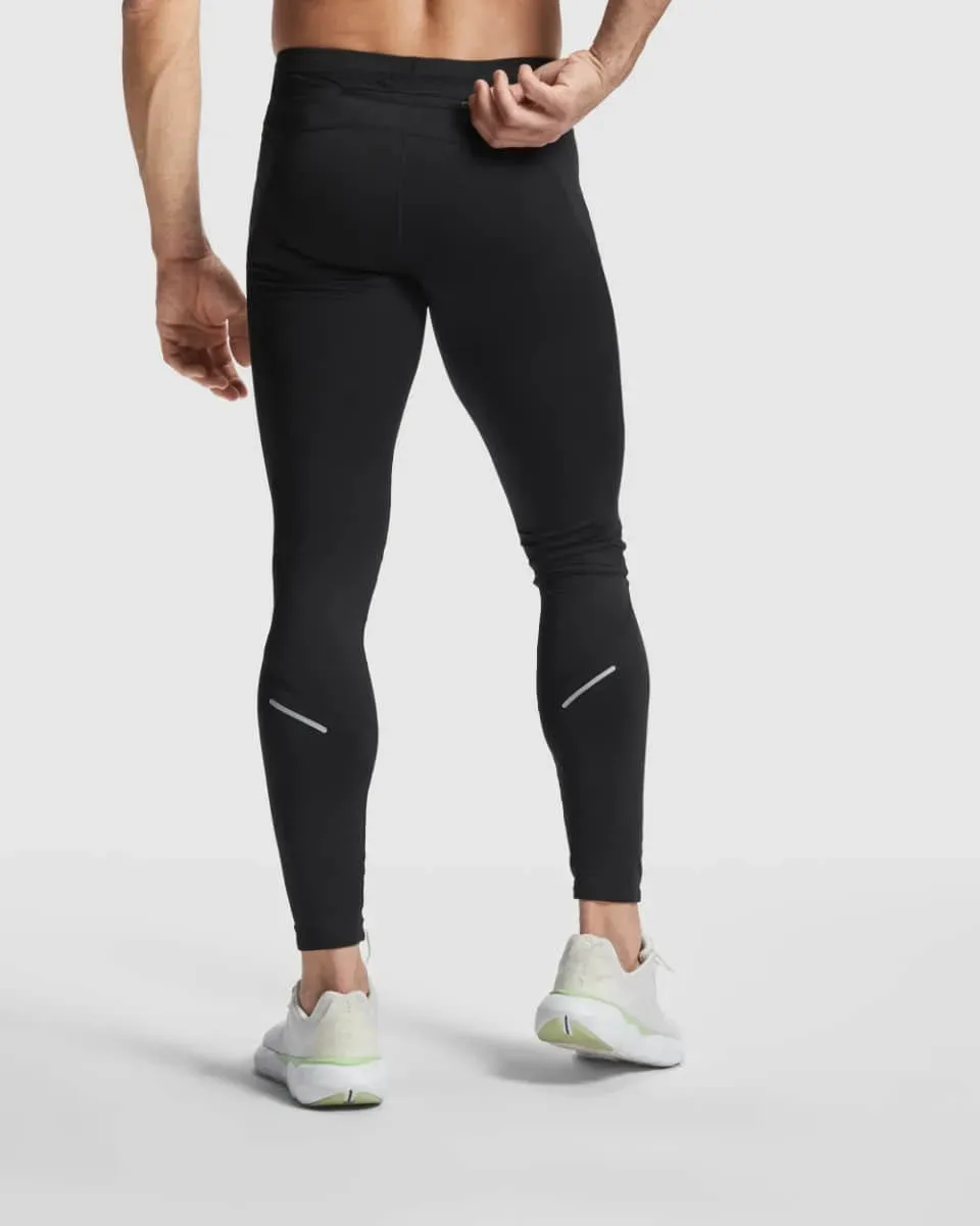 Malla larga deportiva transpirable para hombre con cinturilla elástica y cordón interior cruzado para facilitar ajuste. Detalles reflectantes. Bolsillo exterior trasero con cremallera. Tejido elástico y adaptable al cuerpo.