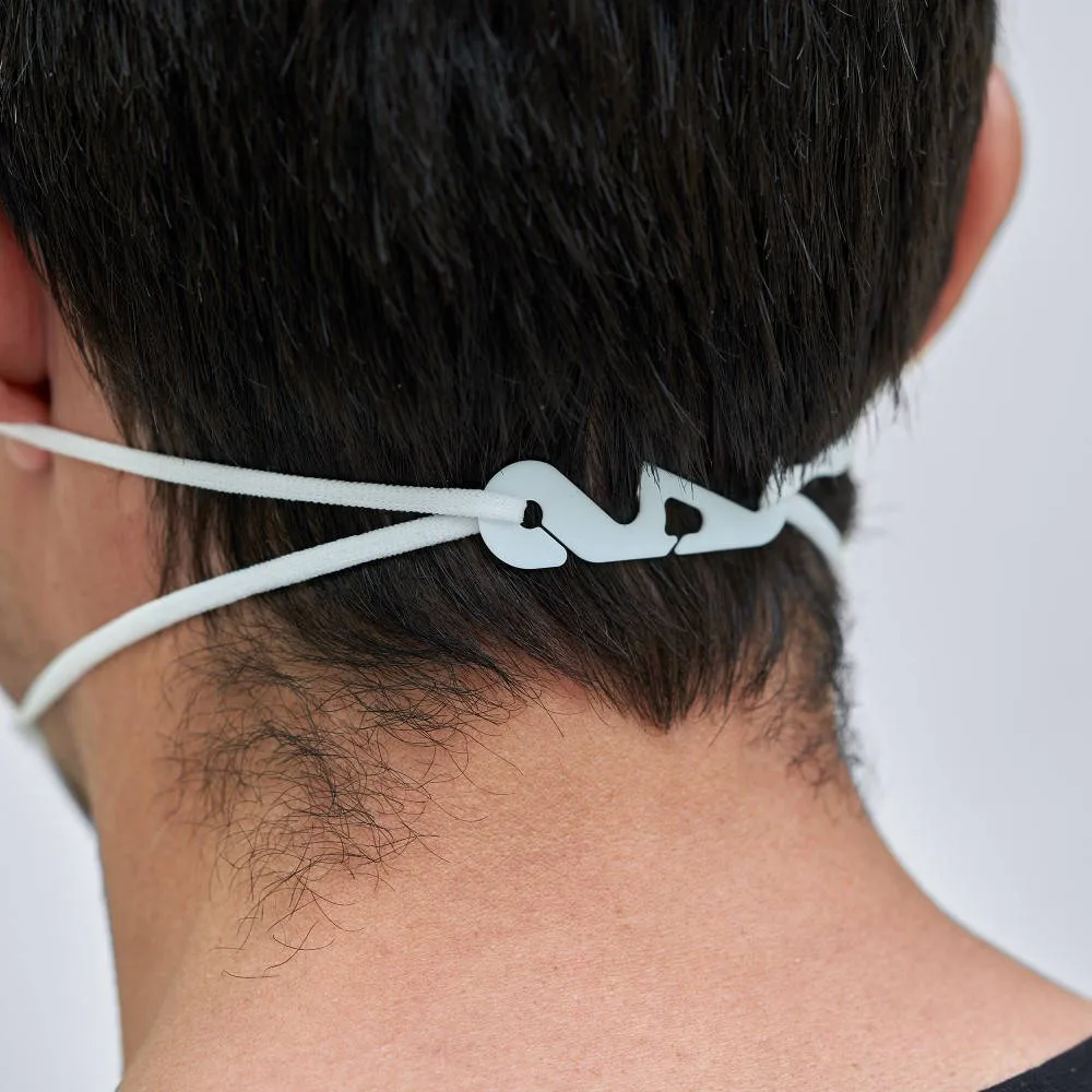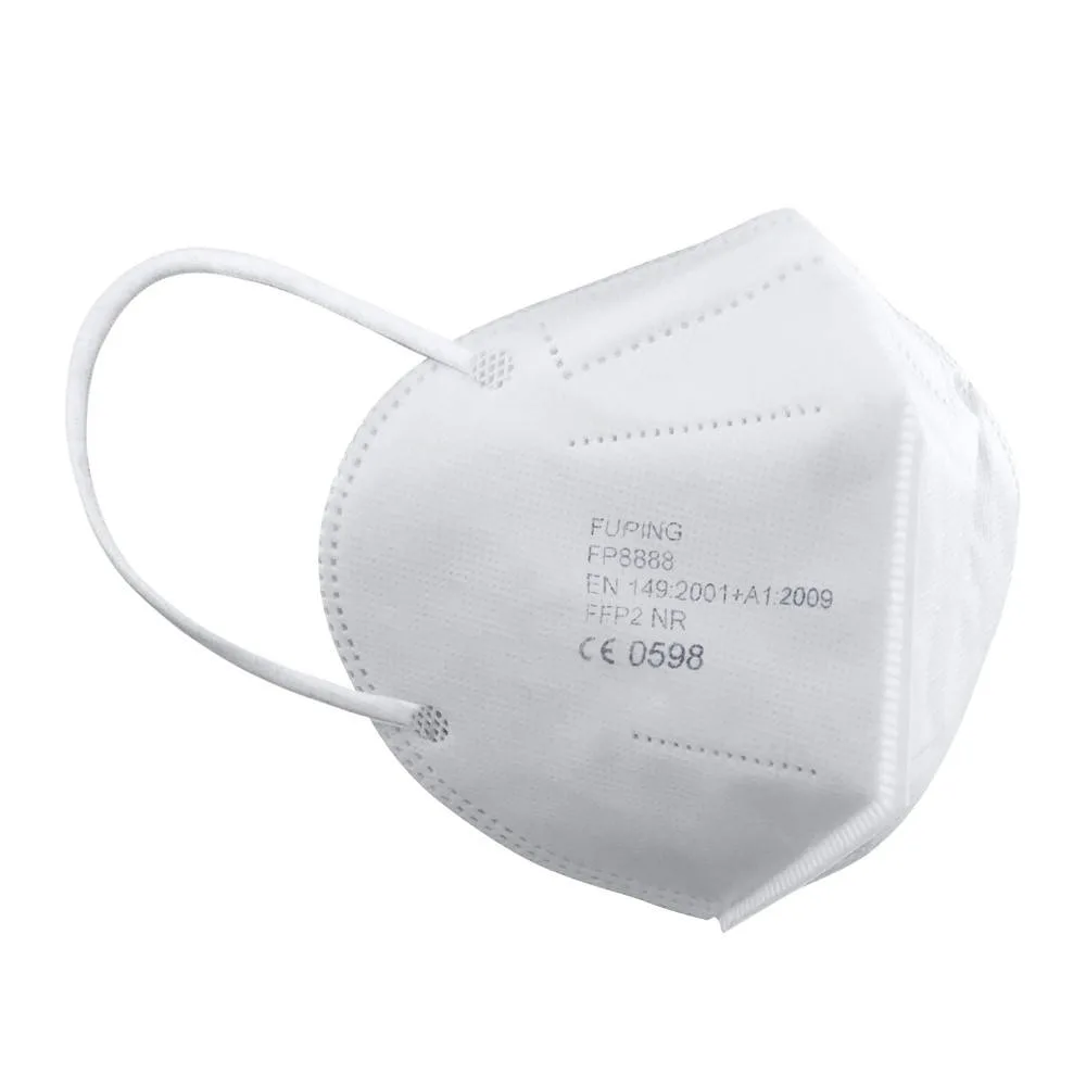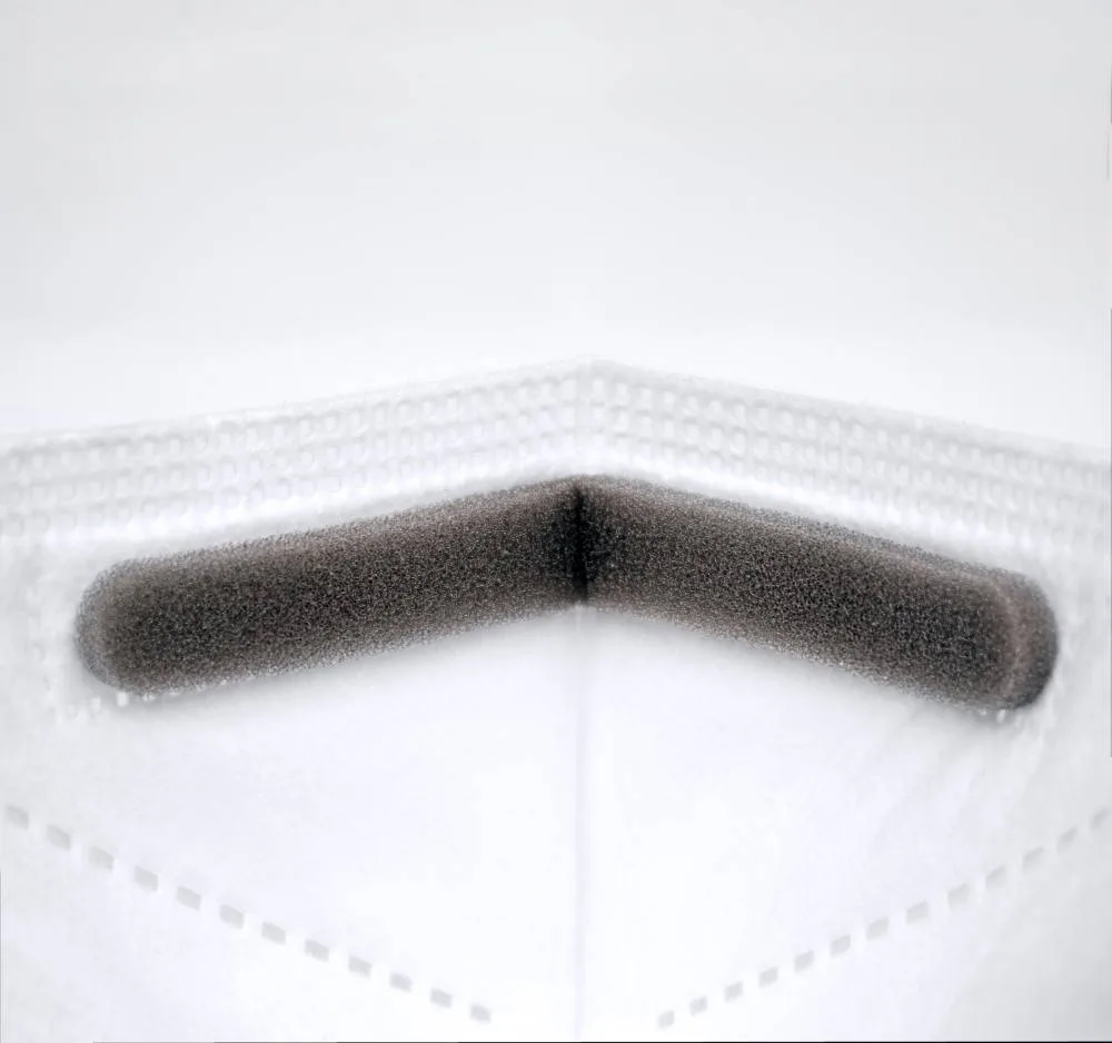 Mascarilla de seguridad FF2 NR de cinco capas. Acabados termosellados, con elásticos de sujeción, accesorio de sujeción craneal, pinza ajustable en la nariz y almohadilla nasal interior.