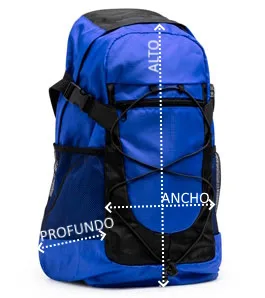 Mochila deportiva realizada en Nylon 210D Ripstop de alta resistencia, con capacidad 30L. Cuenta con un doble compartimento principal con cierre de cremallera y bolsillos interiores. Compartimento de cuerda elástica frontal y bolsillos laterales de rejilla. Espalda y tiras acolchadas. Incluye cinta ajustable lateral.