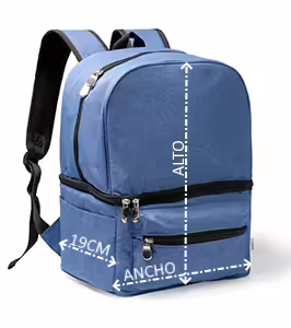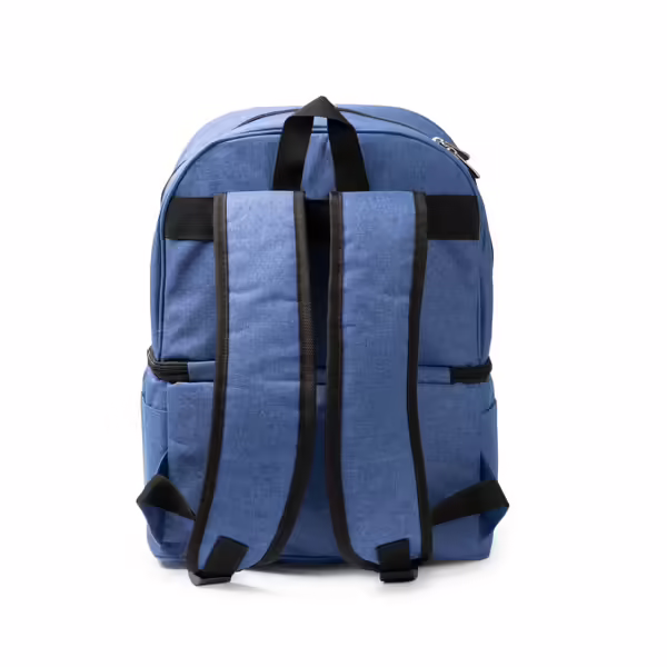 Mochila nevera de RPET 300D con doble compartimento, bolsillo frontal con cierre de cremallera y 2 bolsillos laterales adicionales para pequeño almacenaje. Compartimento superior con 3 bolsillos interiores. Compartimento inferior con interior isotérmico y asas acolchadas.