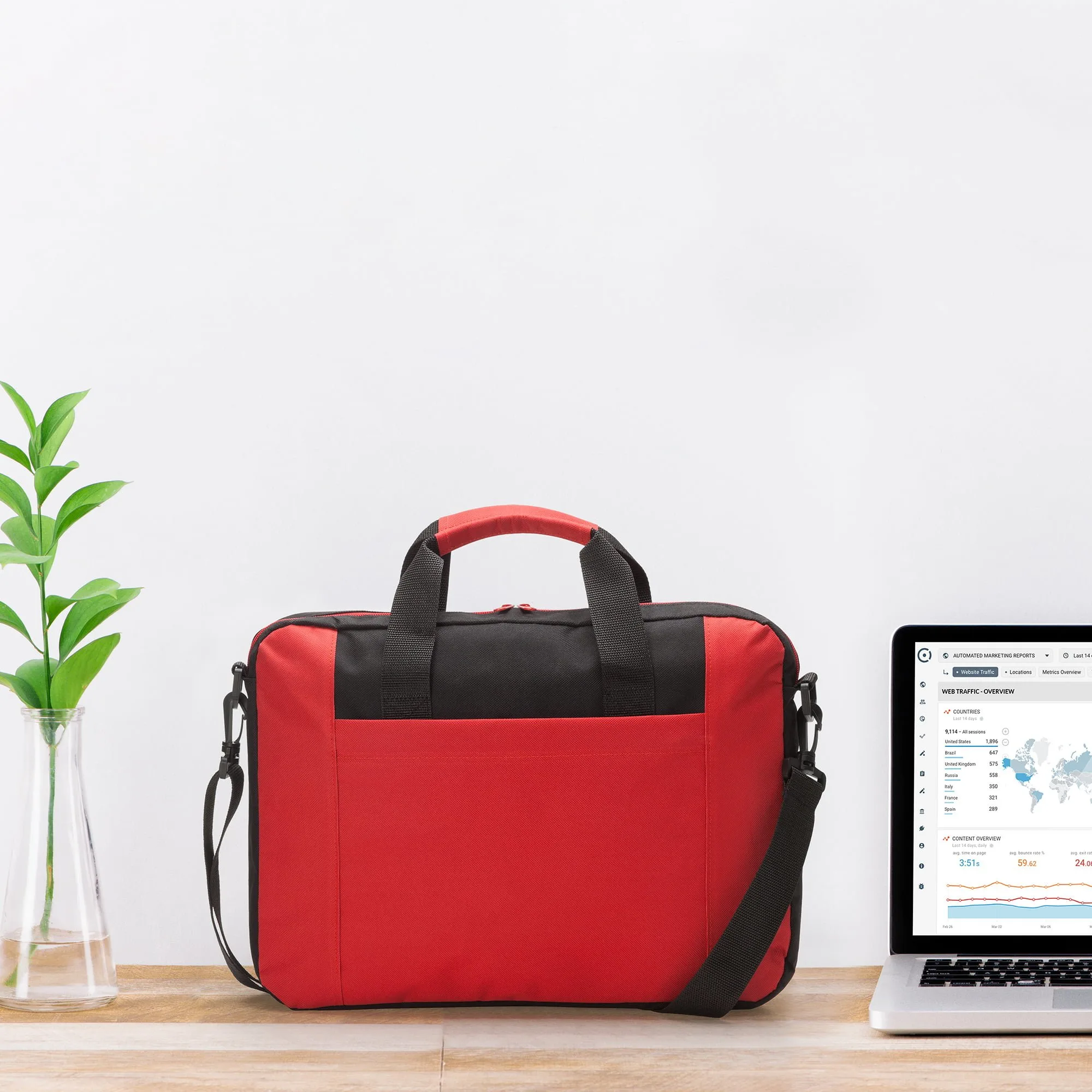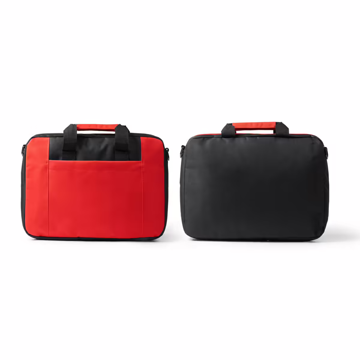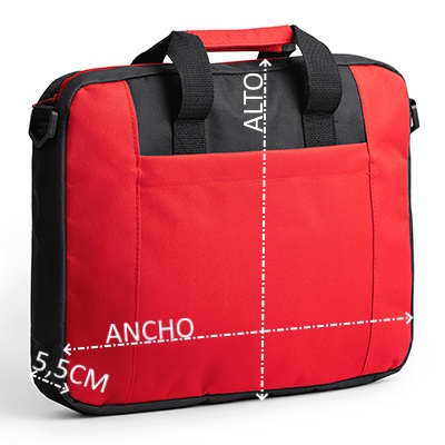 Portadocumentos acolchado para portátil elaborado en suave poliéster 600D con bolsillo exterior. Cuenta con asas de transporte con color a juego y cinta bandolera ajustable con mosquetón para hacerla más cómoda y confortable.