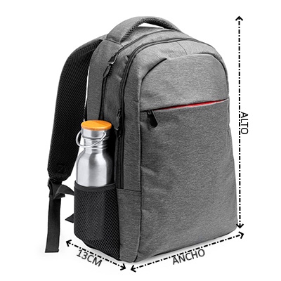 Fabricada en poliéster 100%, la mochila portátil en tejido jaspeado Chucao de la casa Roly tiene doble asa reforzada para los hombros y asa especial de mano, dos bolsillos centrales, un bolsillo frontal con cremallera a contraste y bolsillos laterales de rejilla.