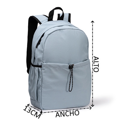 Mochila elaborada en suave nylon. Cuenta con un compartimento principal con bolsillo para portátil de hasta 16″ y un bolsillo frontal exterior con cierre elástico. Incorpora dos bolsillos laterales para botellas de agua con elástico para mayor sujeción.