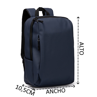 Mochila elaborada en PU Leather de tacto suave. En su compartimento principal incopora bolsillo especial para transporte de dipositivos como Tablets. Con dos bolsillos laterales para transportar otros enseres como botellas y un compartimento frontal con cremallera oculta. Asas acolchadas ajustables y cremalleras en negro.