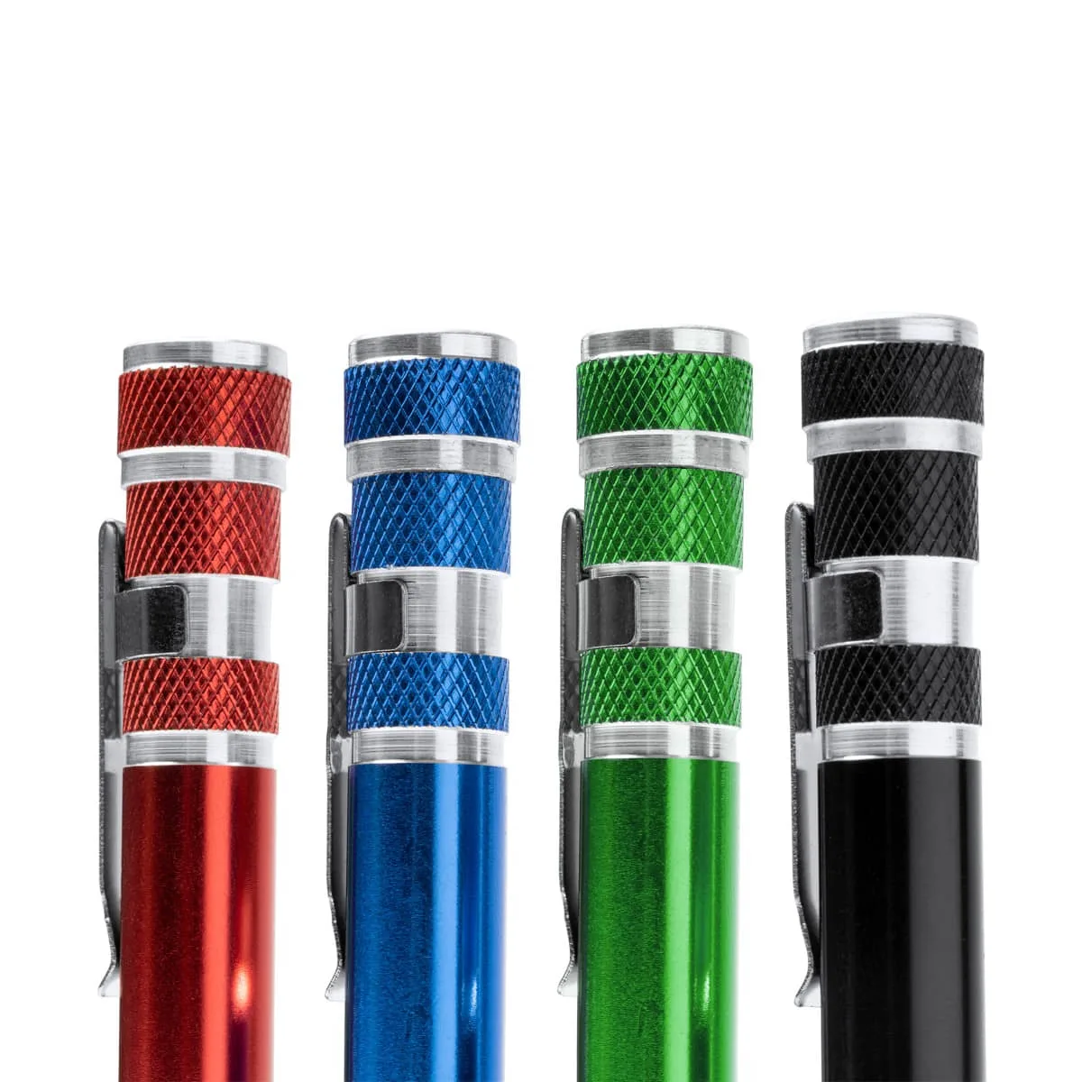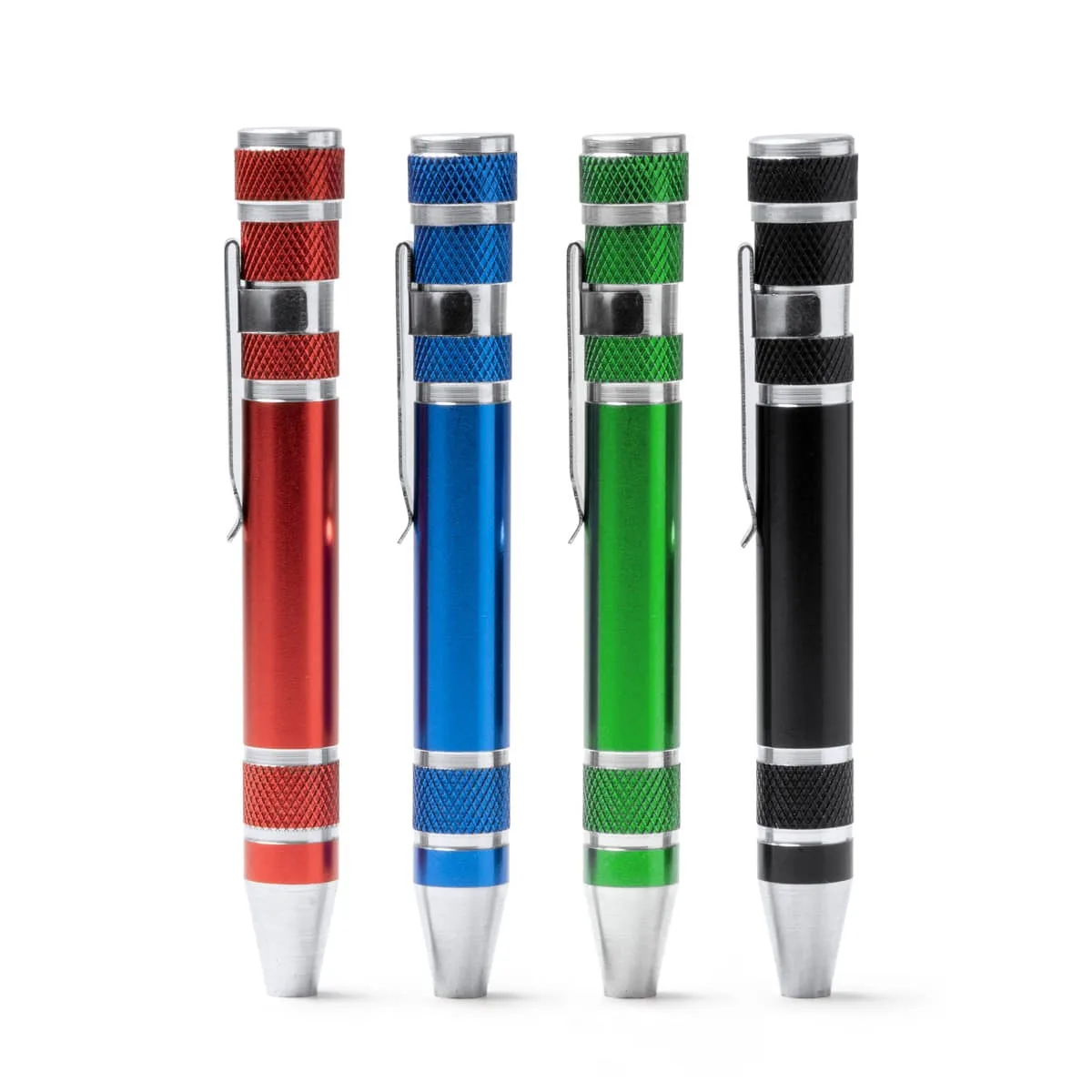 Multiherramienta de aluminio en forma de bolígrafo. Incluye 8 cabezales de destornillador, estrella y planos.