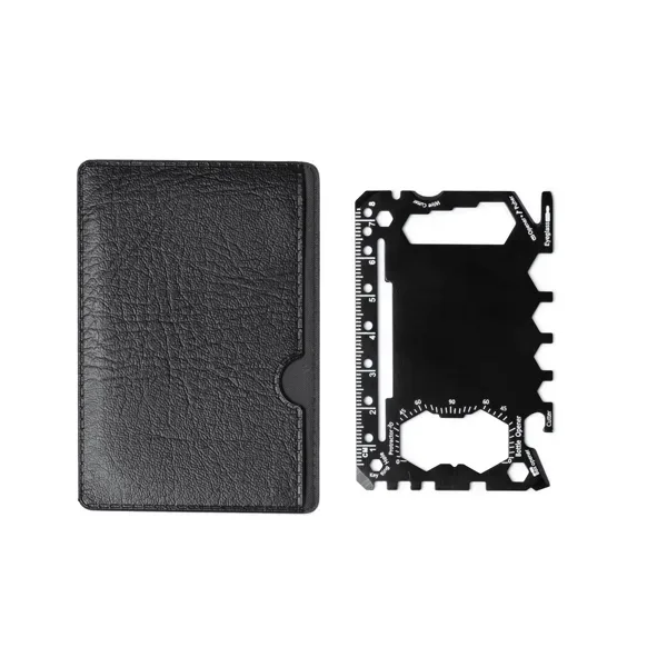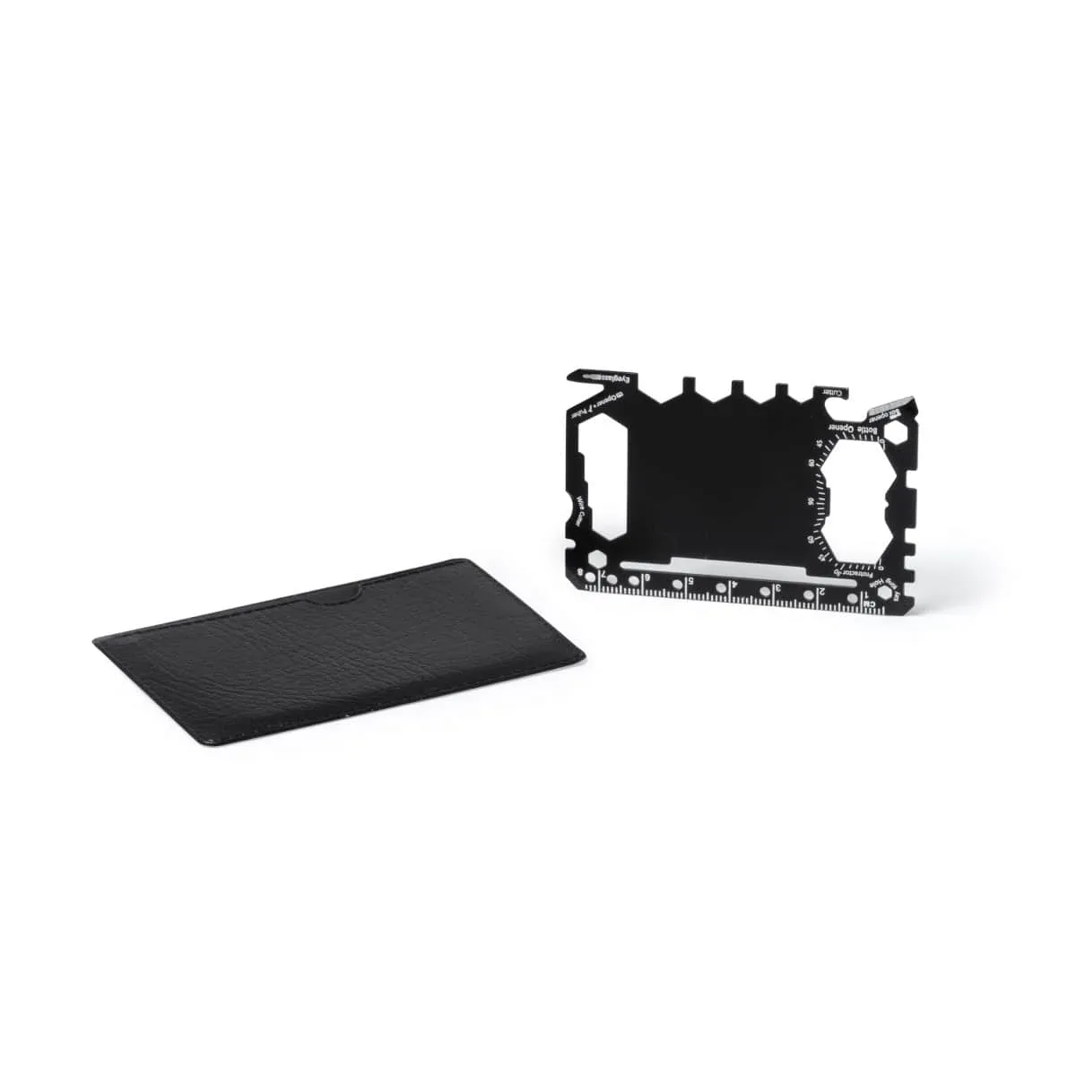 Multiherramienta de acero inoxidable. 17 funciones integradas. Versátil herramienta que incluye: abrelatas, cuchillo afilado, destornillador, regla, abrebotellas, llaves inglesas, llaves de mariposa, sierra, indicador de dirección y transportador de ángulos. Presentado en funda de PU.