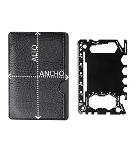 Multiherramienta de acero inoxidable. 17 funciones integradas. Versátil herramienta que incluye: abrelatas, cuchillo afilado, destornillador, regla, abrebotellas, llaves inglesas, llaves de mariposa, sierra, indicador de dirección y transportador de ángulos. Presentado en funda de PU.