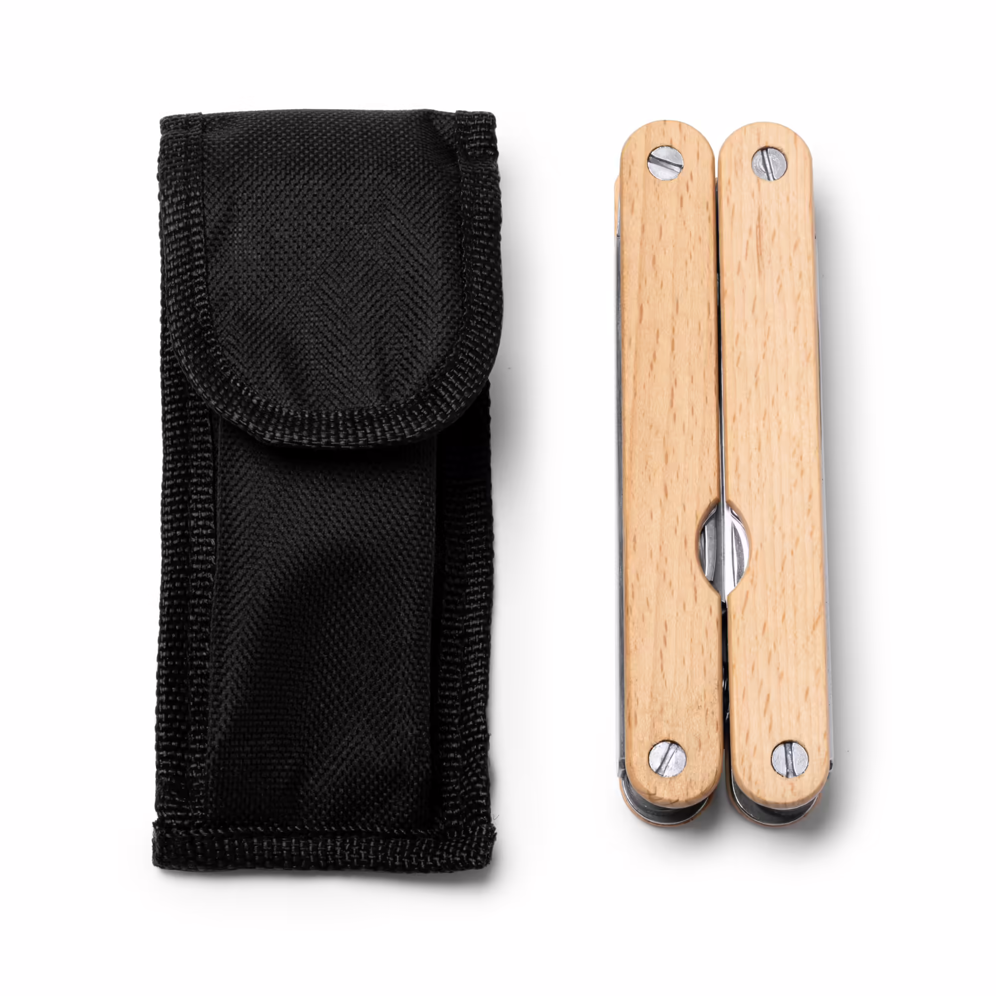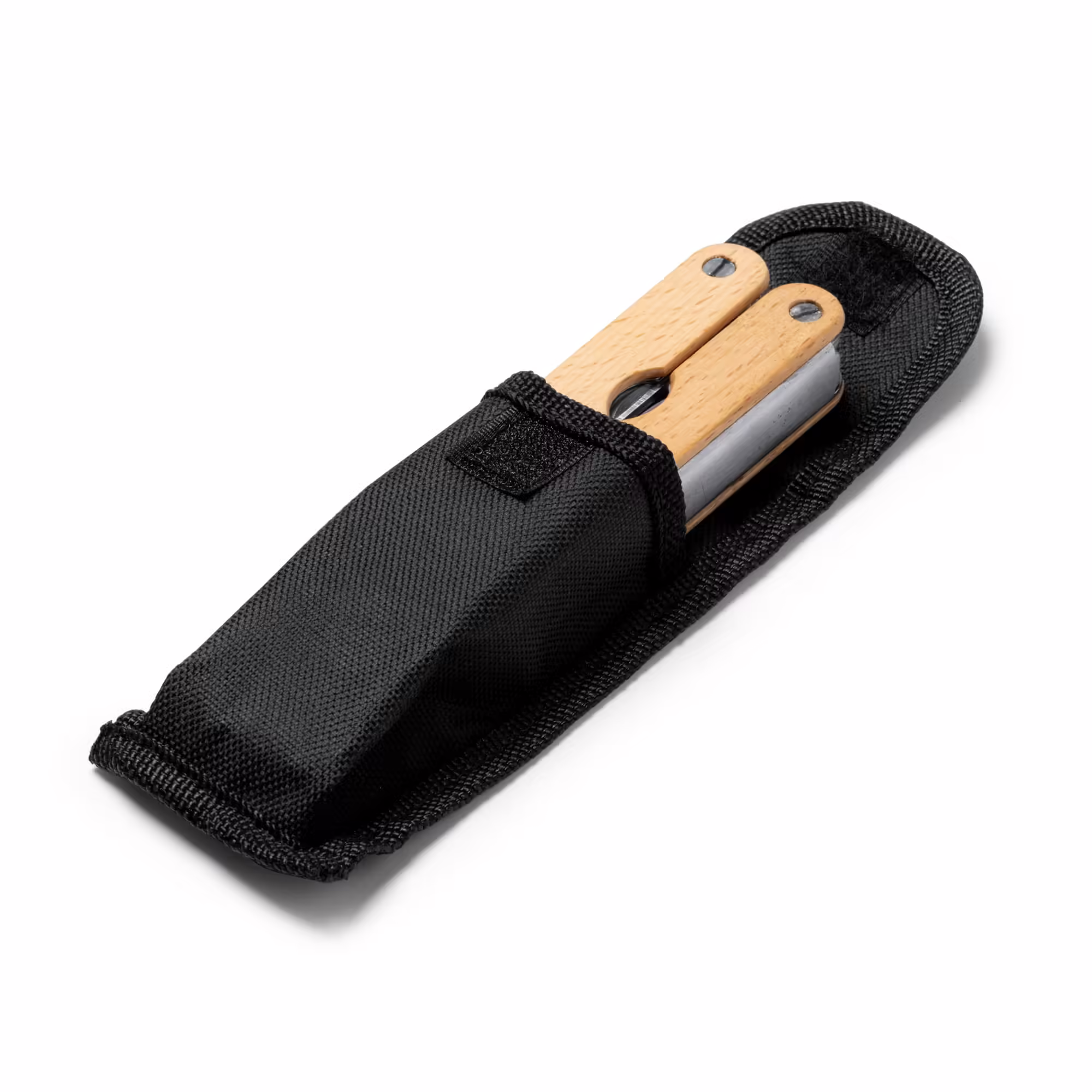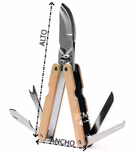 Multiherramientas de acero inoxidable y empuñadura de bambú. 6 funciones: tijera para podar, navaja, sierra, lima, destornillador y abridor.