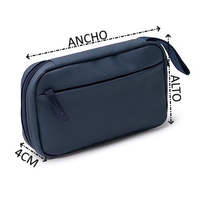 Neceser elaborado en poliuretano de apertura completa con cremallera. Cuenta con dos compartimentos interiores de malla: uno con cierre de cremallera y otro subdividido en bolsillos más pequeños. Incluye un bolsillo frontal con cierre de cremallera. Los tiradores de las cremalleras y la cinta de transporte están realizados a a color a conjunto del cuerpo.