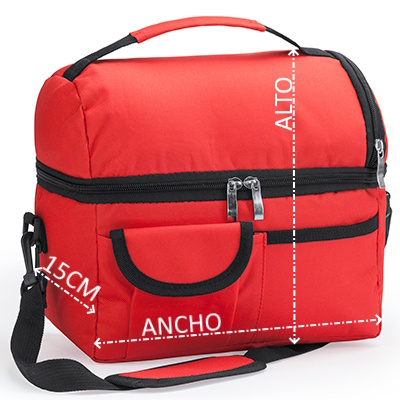 Nevera multiusos de poliéster 600D. Compartimentos interiores principales isotérmicos para el mantenimiento de los alimentos y bebidas a buena temperatura. Además, cuenta con prácticos bolsillos exteriores para transportar elementos de menor tamaño. Cinta bandolera ajustable acolchada con mosquetón para mayor funcionalidad y comodidad en su transporte. Idónea para llevar la comida al trabajo.