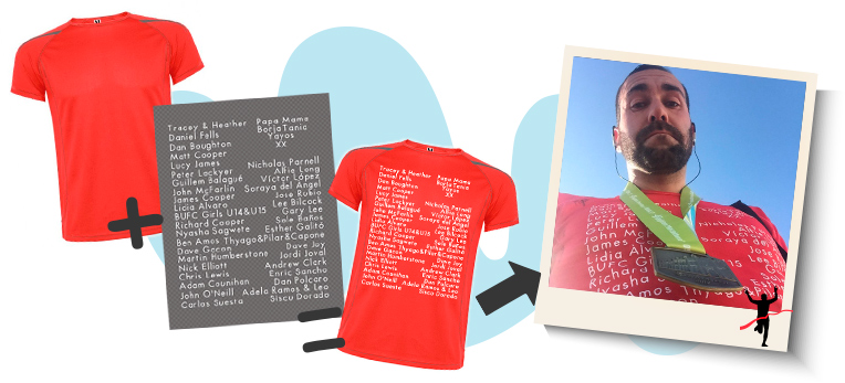 También, puedes hacernos un montaje con tu petición de forma más directa, desde el diseñador online. Una herramienta muy fácil de usar con la que podrás ver cómo queda tu diseño en la camiseta que elijas. Como ya hizo en su día uno de nuestros clientes, al pedir su camiseta de manga corta técnica Sepang 0416 de Roly en color rojo, con un diseño que nos solicitó personalizado. La quería tener disponible para correr la maratón de Brighton, y este fue el resultado.
