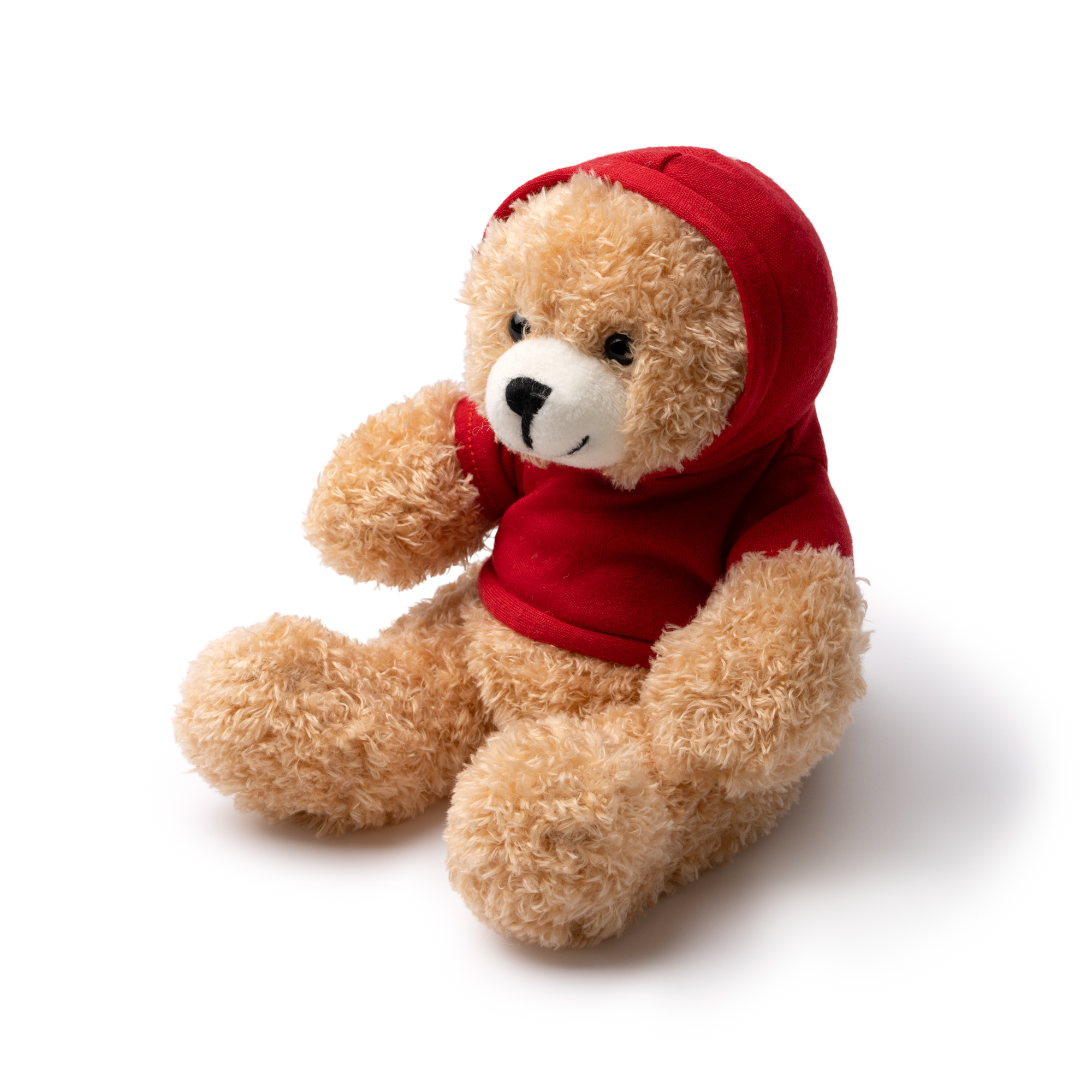 Osito de peluche con sudadera lisa realizada en suave poliéster de tacto suave. Ideal para regalar. Diseño en posición sentado.