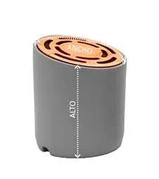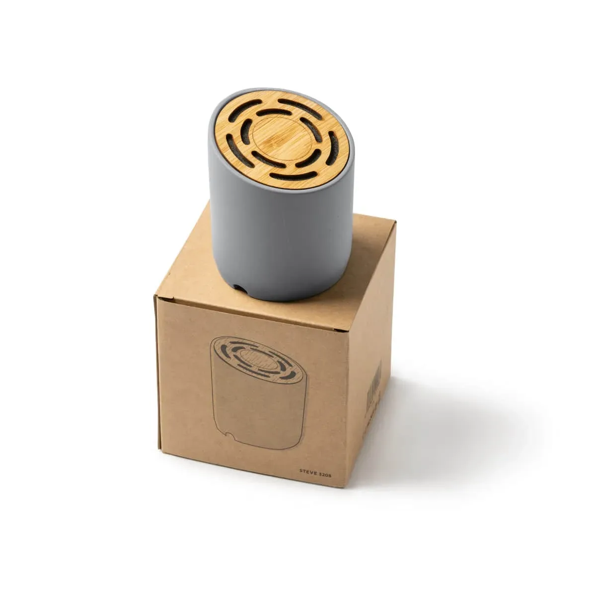 Altavoz inalámbrico Bluetooth 5.0 con cuerpo redondo de cemento y superficie de bambú natural. Potencia 3W y batería recargable. Cable de carga incluido. Presentación en caja diseño eco.