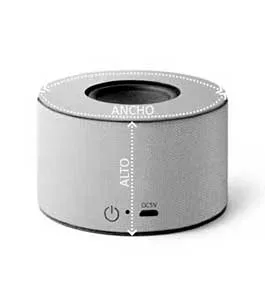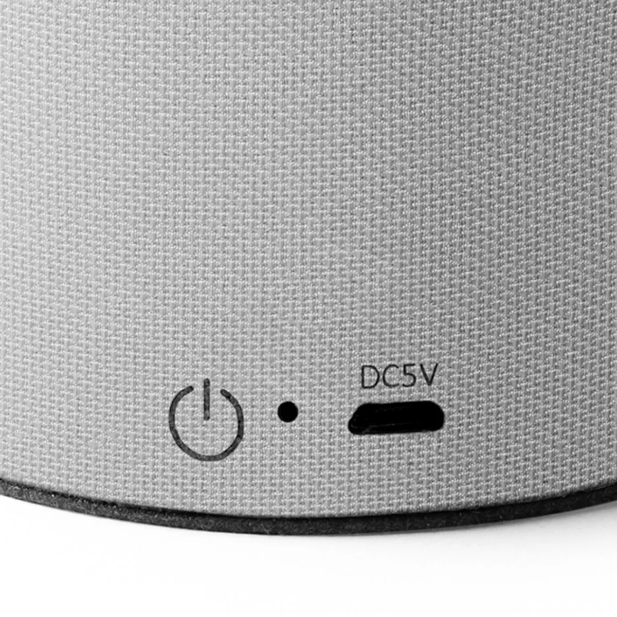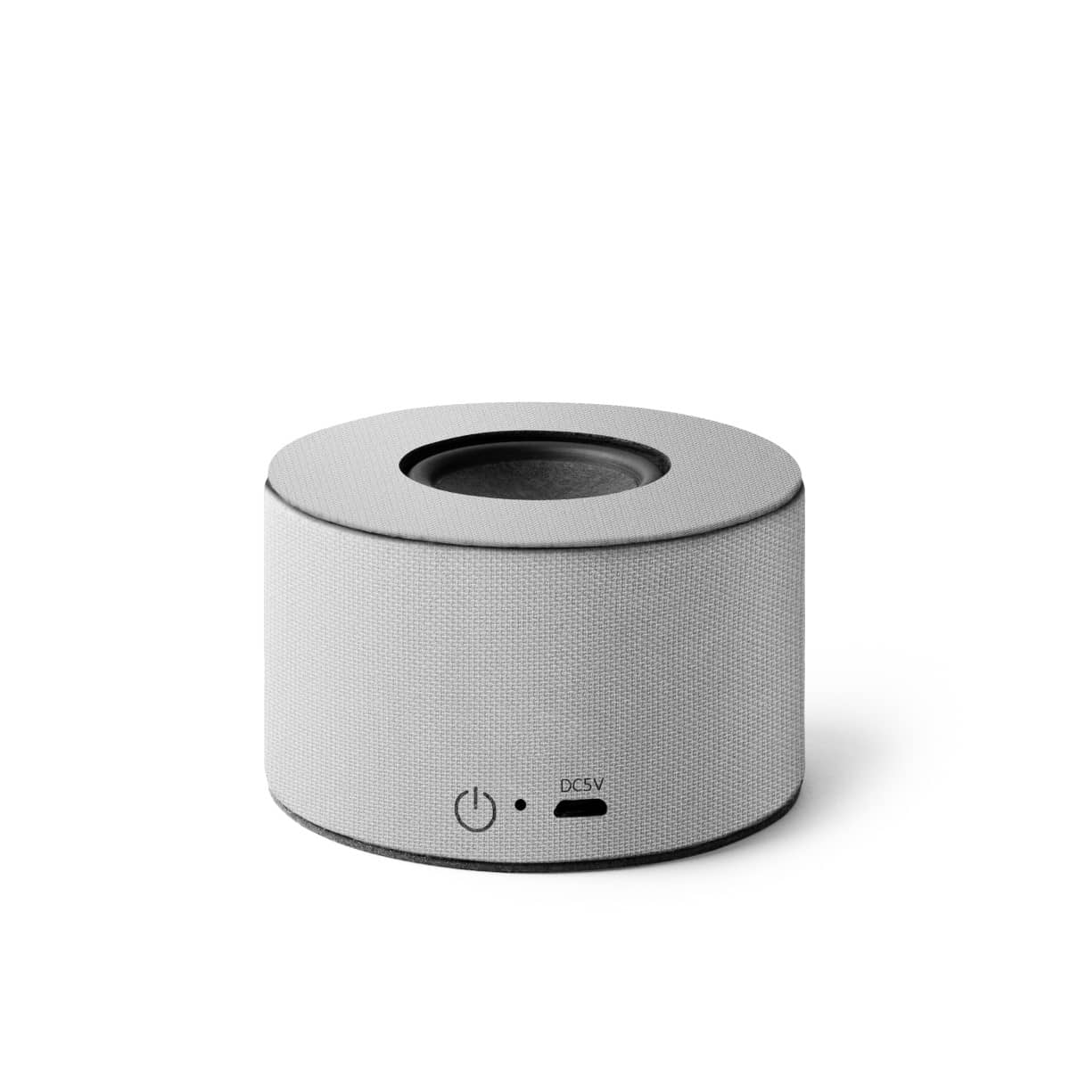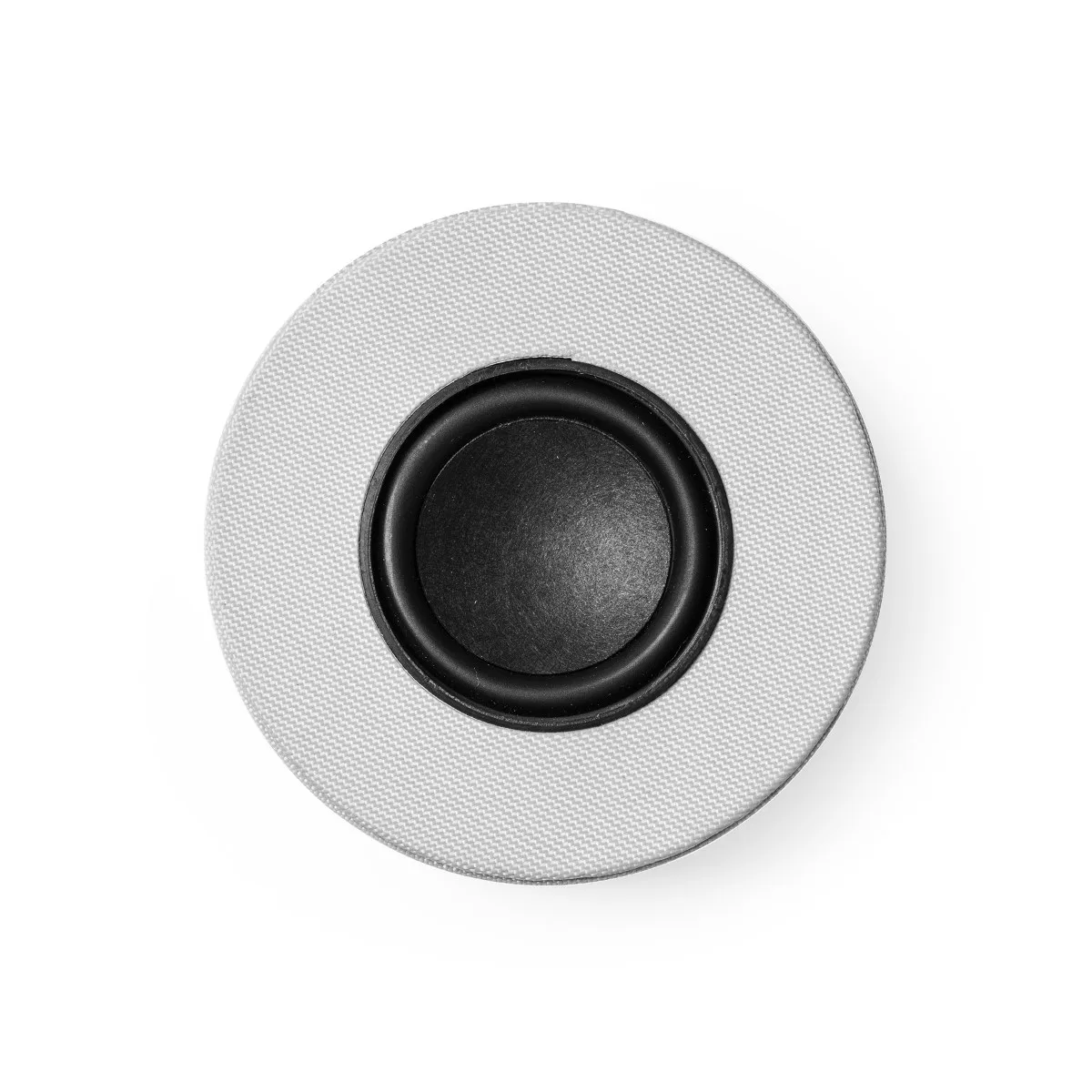 Altavoz inalámbrico con cuerpo tejido en RPET con membrana visible. Bluetooth 5.0. Potencia 3W. Batería recargable. Cable incluido.