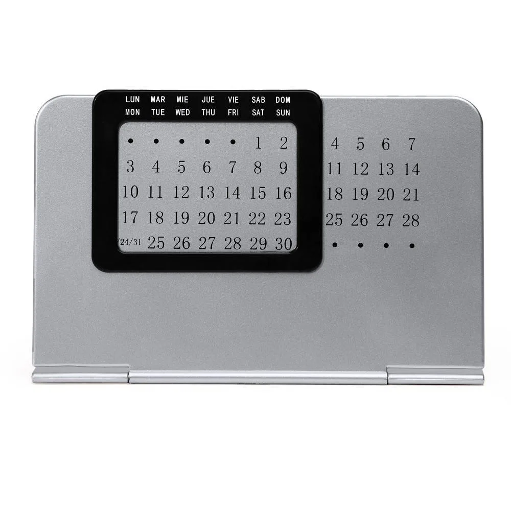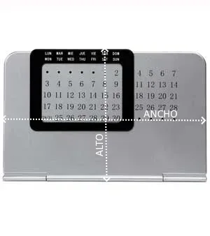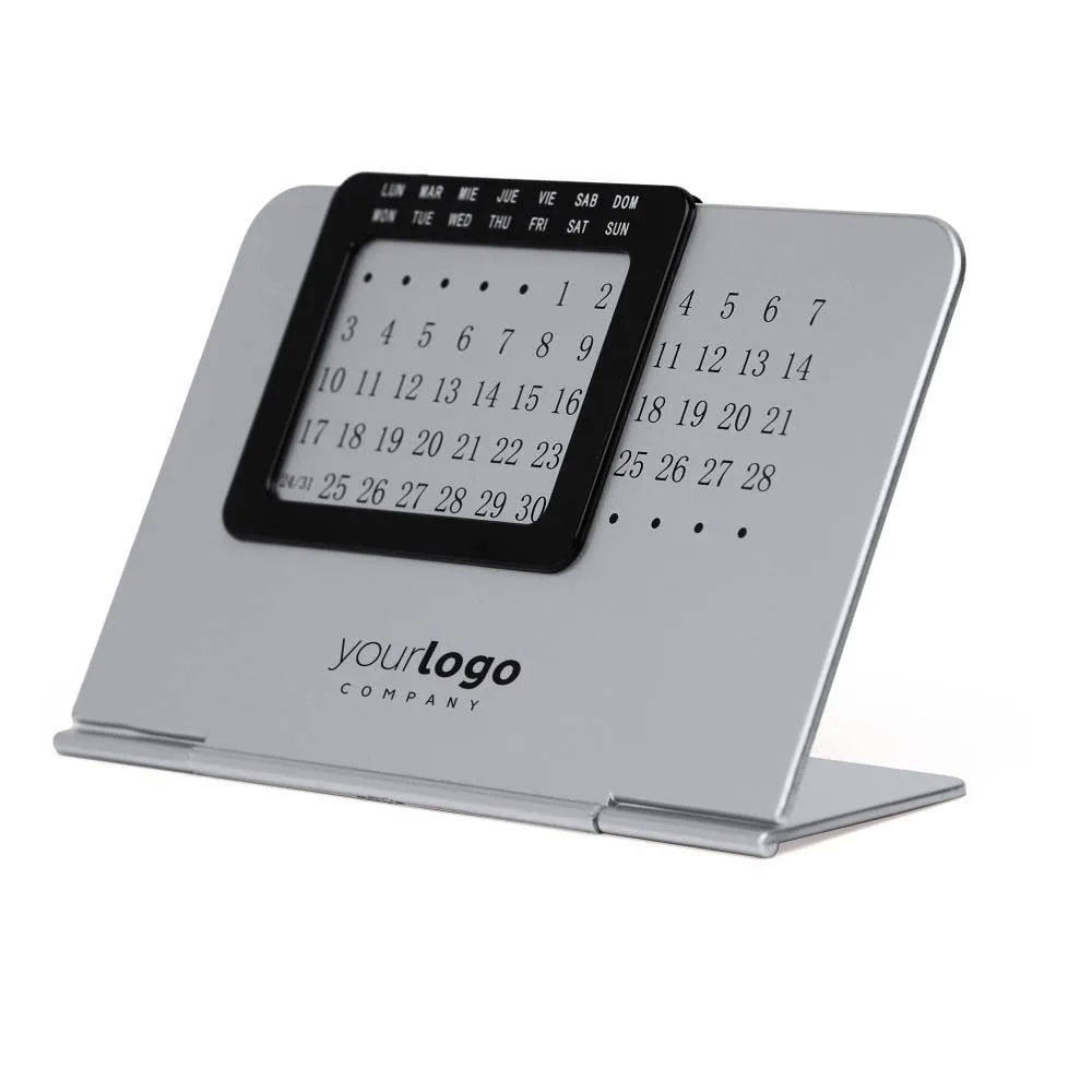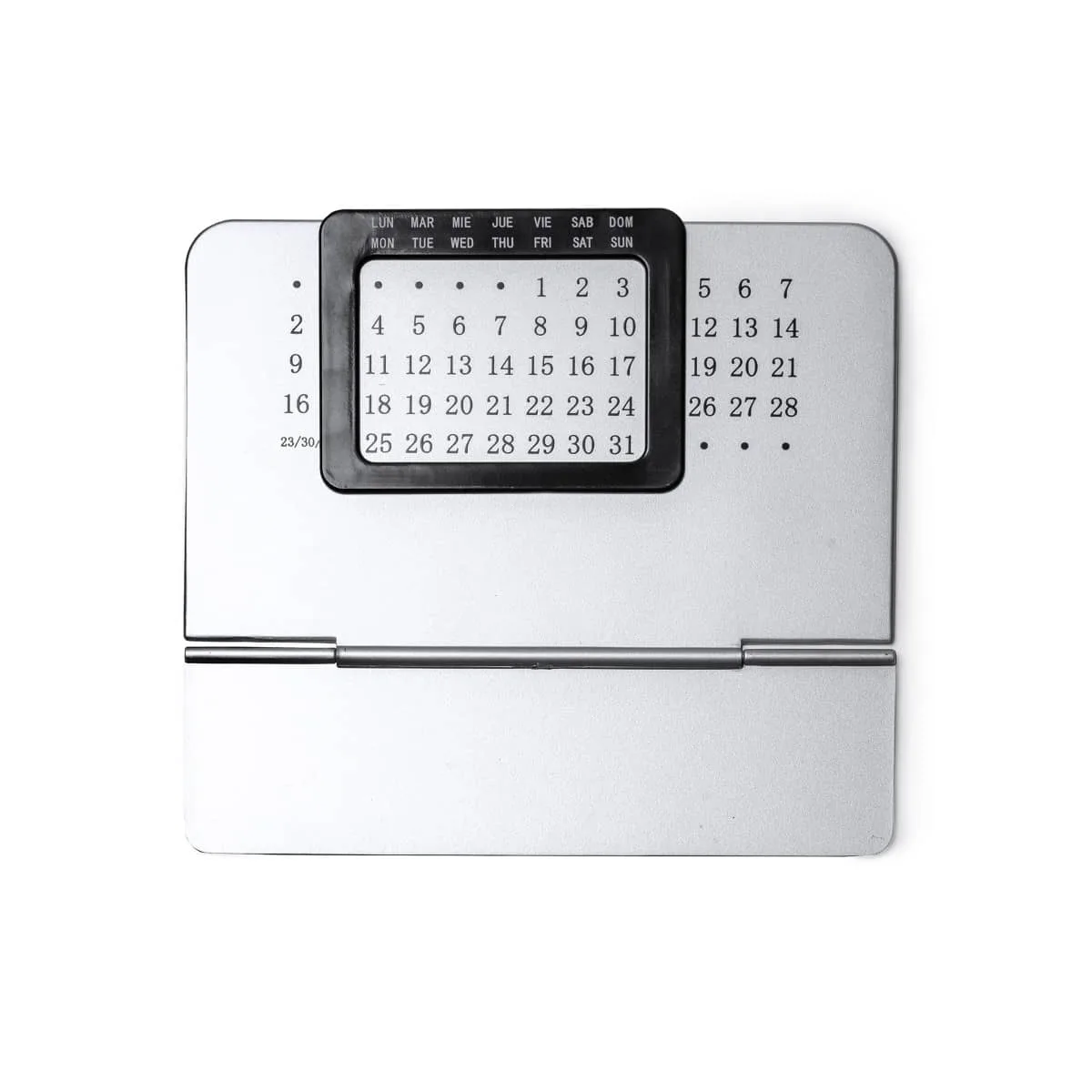 Calendario perpetuo de mesa. Compatible para su uso en cualquier año. Compuesto por dos partes: soporte plateado con panel numérico y marco deslizable negro con los días de la semana en español e inglés.