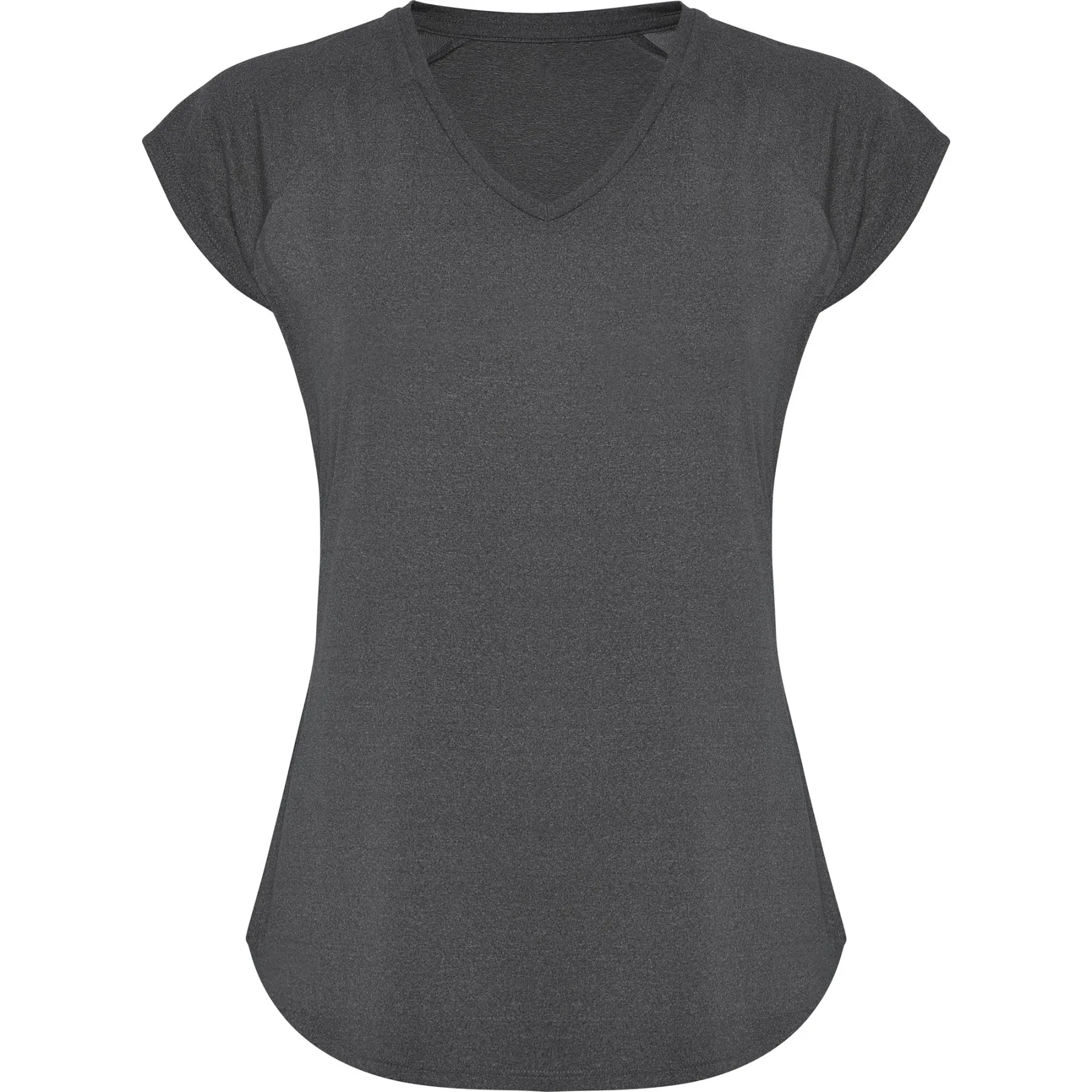 Camiseta multideporte de mujer manga corta estilo manga raglán. Cuello pico. Tejido poliéster con tacto algodón. Corte entallado.