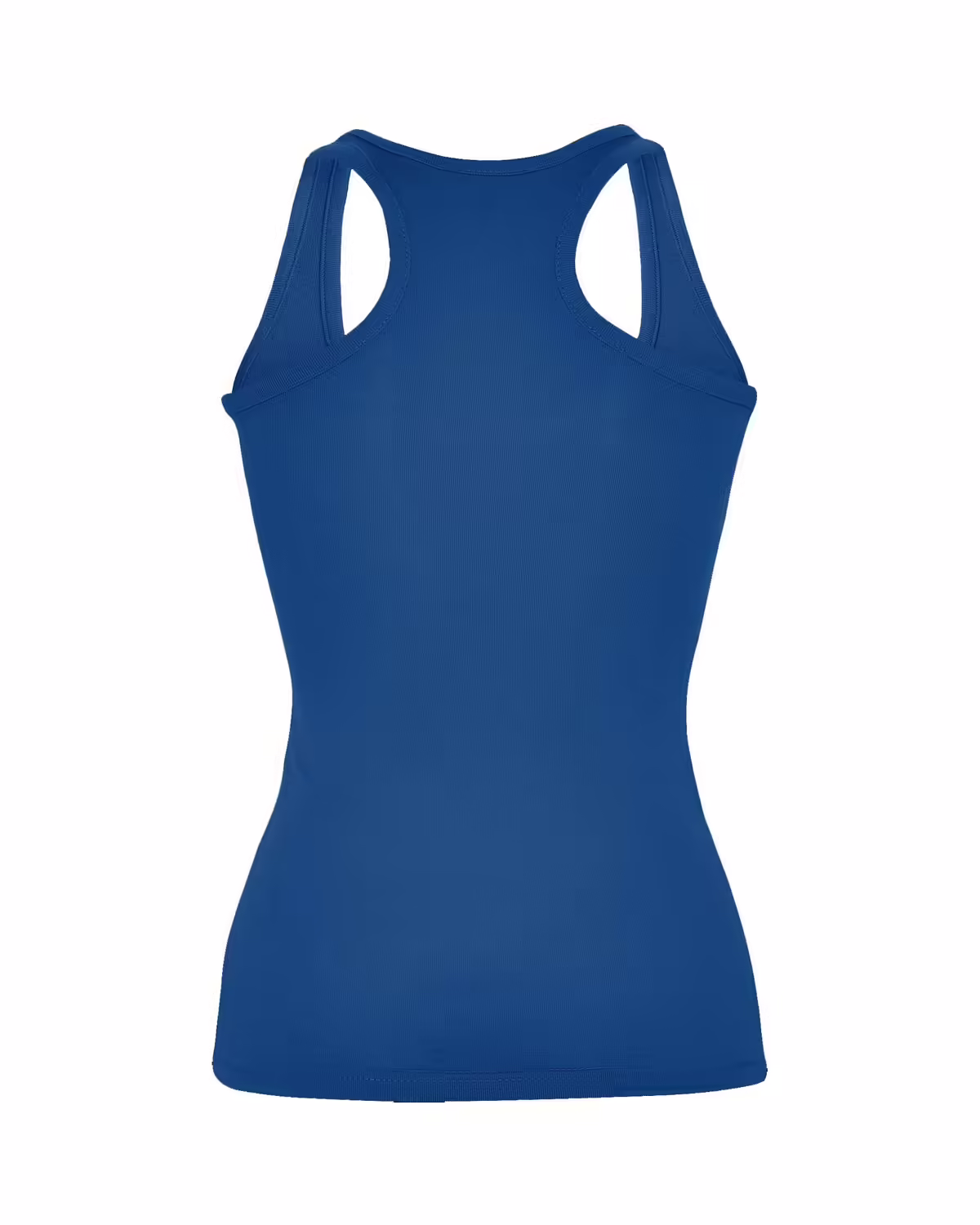Camiseta entallada, con sisas y escote ribeteado, ancho y enrollado. Espalda estilo nadadora y costuras laterales.