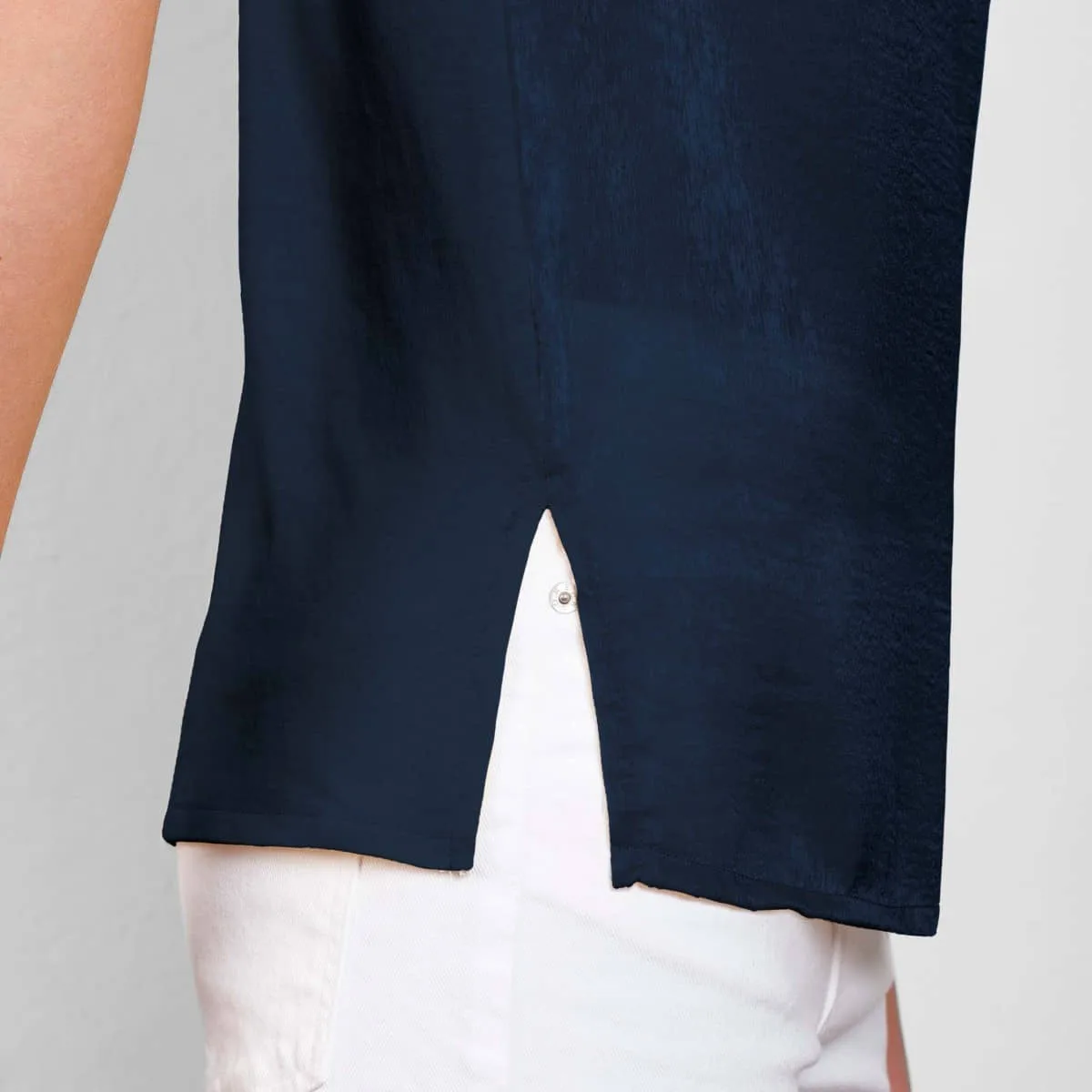 Por delante, Maya ha sido confeccionada en poliéster satén, por detrás en algodón con patronaje ligeramente más largo que el delantero. Luce, además, un escote amplio, bolsillo en pecho izquierdo y aperturas laterales en el bajo.