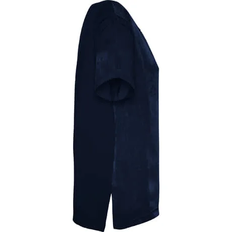 Camiseta de mujer de manga corta y escote amplio. Bolsillo en pecho izquierdo. El patronaje de la espalda es ligeramente más largo que el delantero, con aperturas laterales en el bajo.