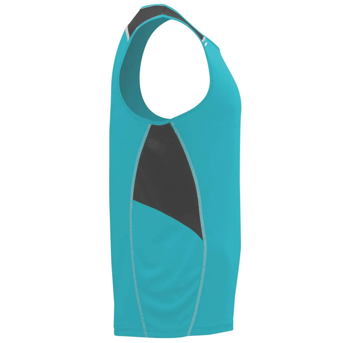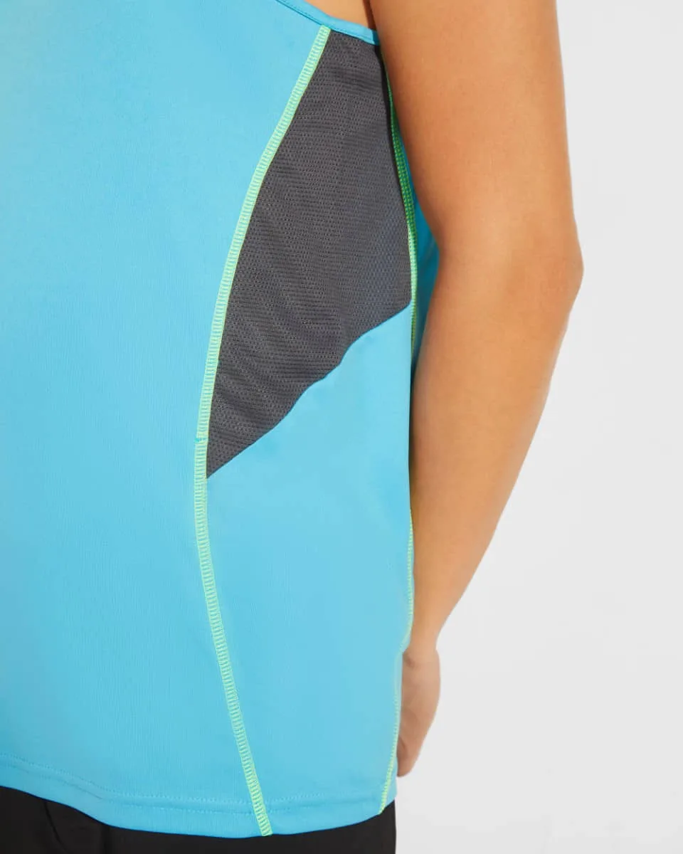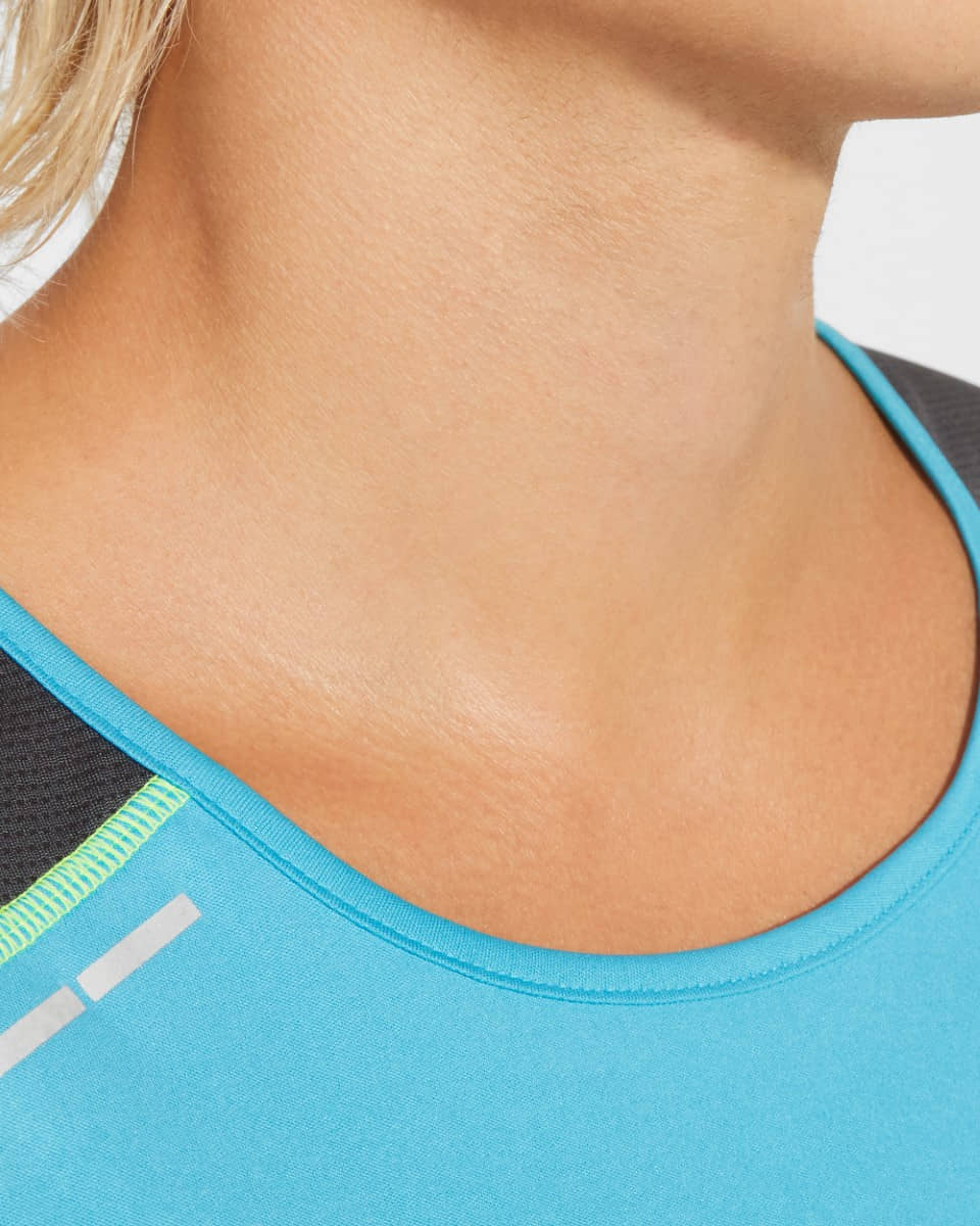 Camiseta técnica de tirantes con detalles reflectantes. Cuello redondo con cubrecosturas de refuerzo. Combinada en dos tejidos de poliéster y tres colores. Tejido principal interlock, paneles laterales y superiores en tejido microperforado para mayor transpiración. Fácil secado.