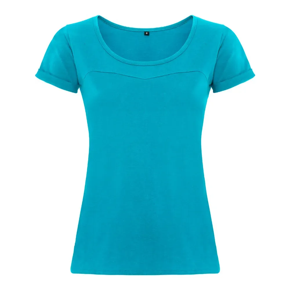 Camiseta manga corta con diseño femenino. Corte en el pecho como detalle, con escote redonde ribeteado en punto liso, de manga corta vuelta y aberturas laterales redondeadas en el bajo. Costuras remalladas a 4 hilos dándole mayor durabilidad.
