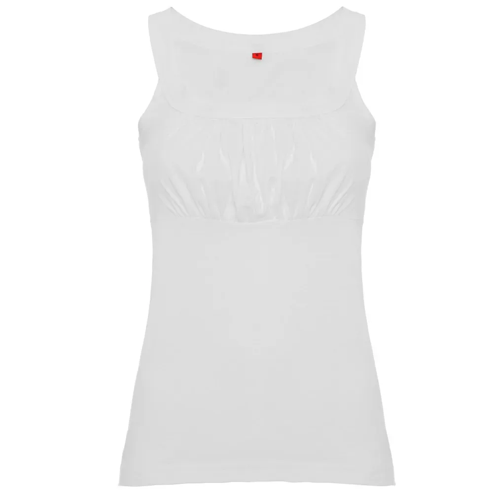 Camiseta corte imperio de tirantes con escote redono y pecho fruncido. Corte entallado. Costuras laterales remalladas a 4 hilos dándole mayor durabilidad.