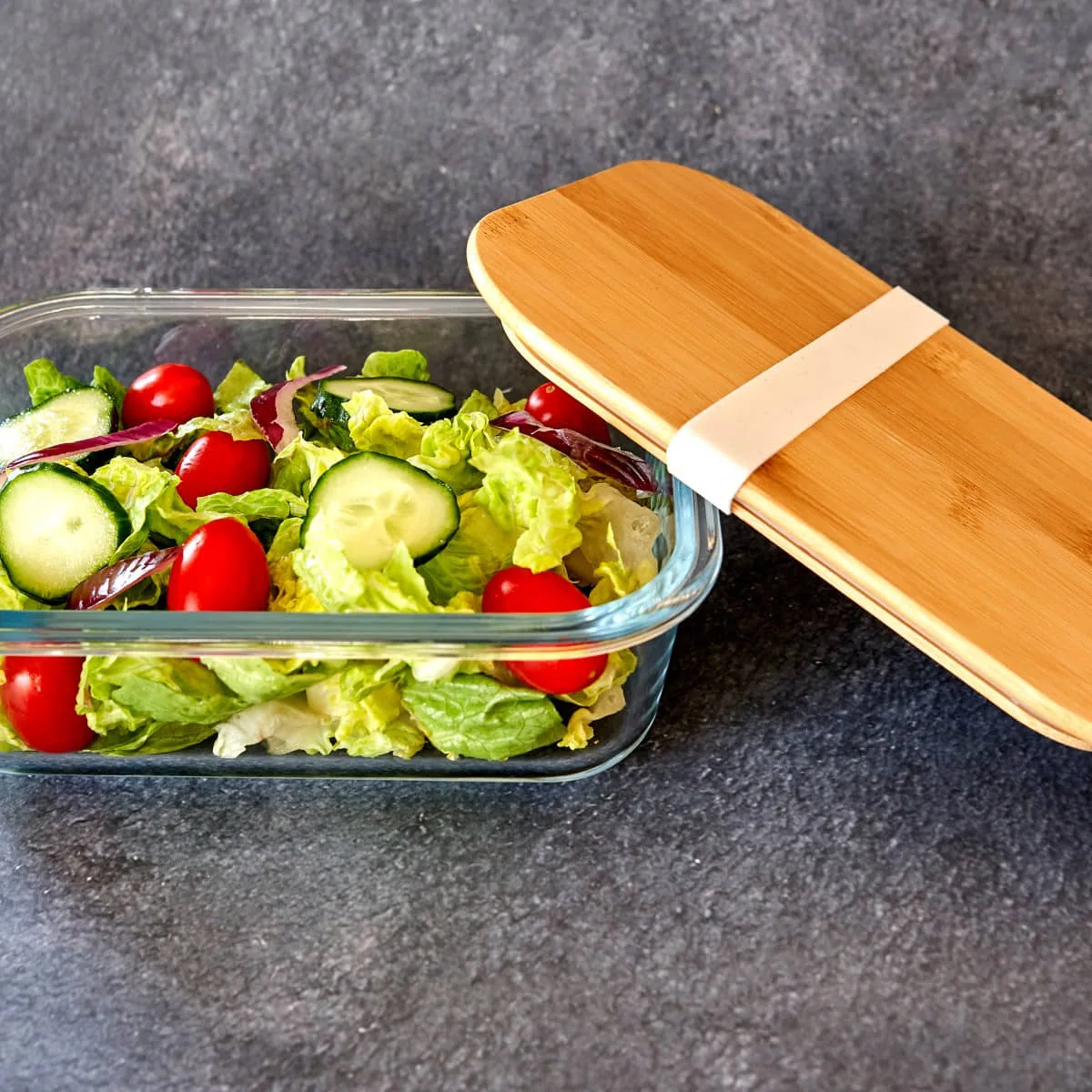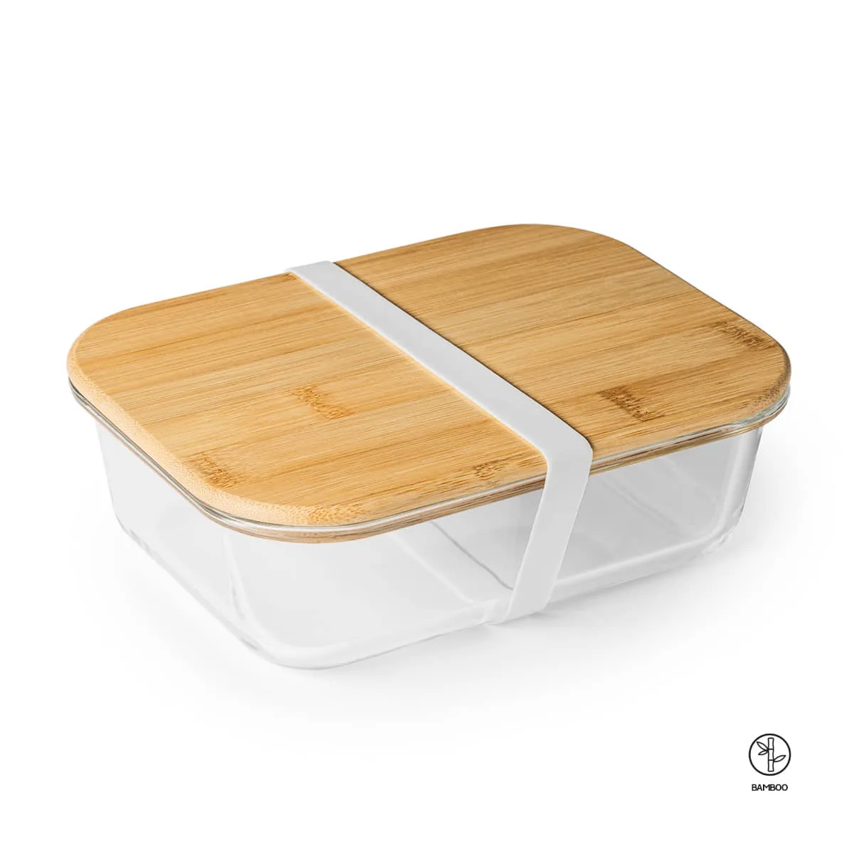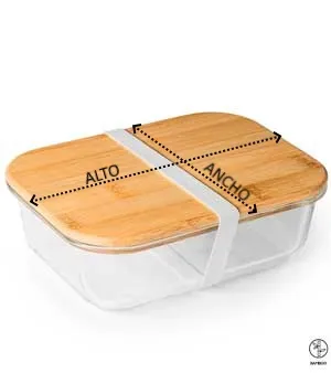 ESTE PRODUCTO SE DESCATALOGARÁ EN 2025 – Fiambrera de cristal borosilicato, con tapa de bambú y banda de silicona para su cierre. Transporta tu comida, con una fiambrera personalizada.