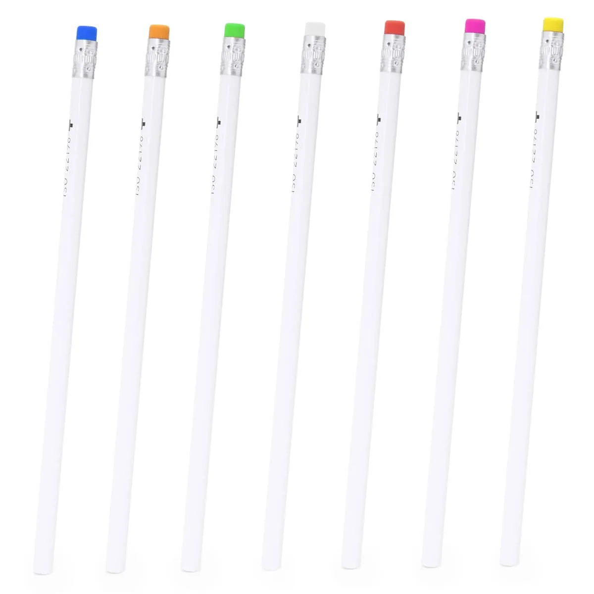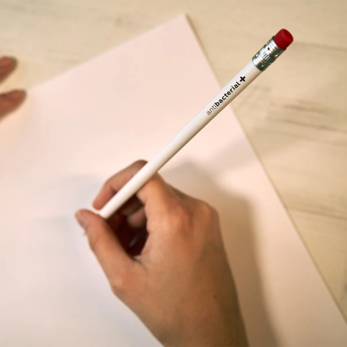 ESTE PRODUCTO SE DESCATALOGARÁ EN 2025 – Lápiz blanco antibacteriano de madera con goma disponible en varios colores. Logo anti-bacterias impreso en parte alta del lápiz.