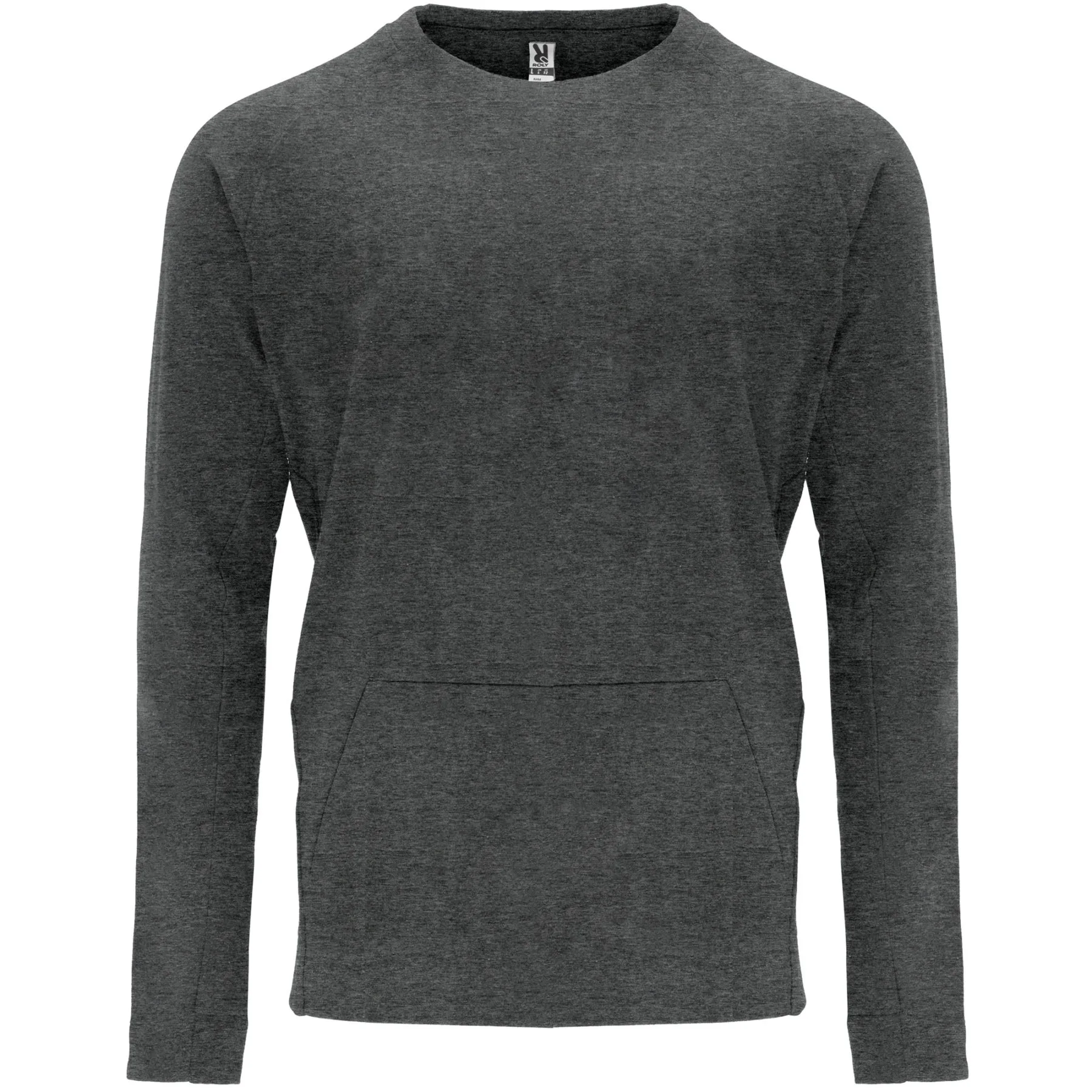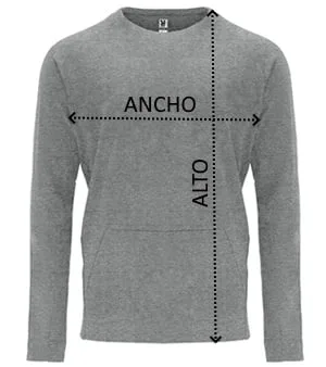 Sudadera de manga larga estilo ranglán. Parte posterior del cuello y parte inferior de los puños en canalé 1×1. Bolsillo canguro con terminación sin costuras. Costuras laterales diagonales hacia parte frontal.