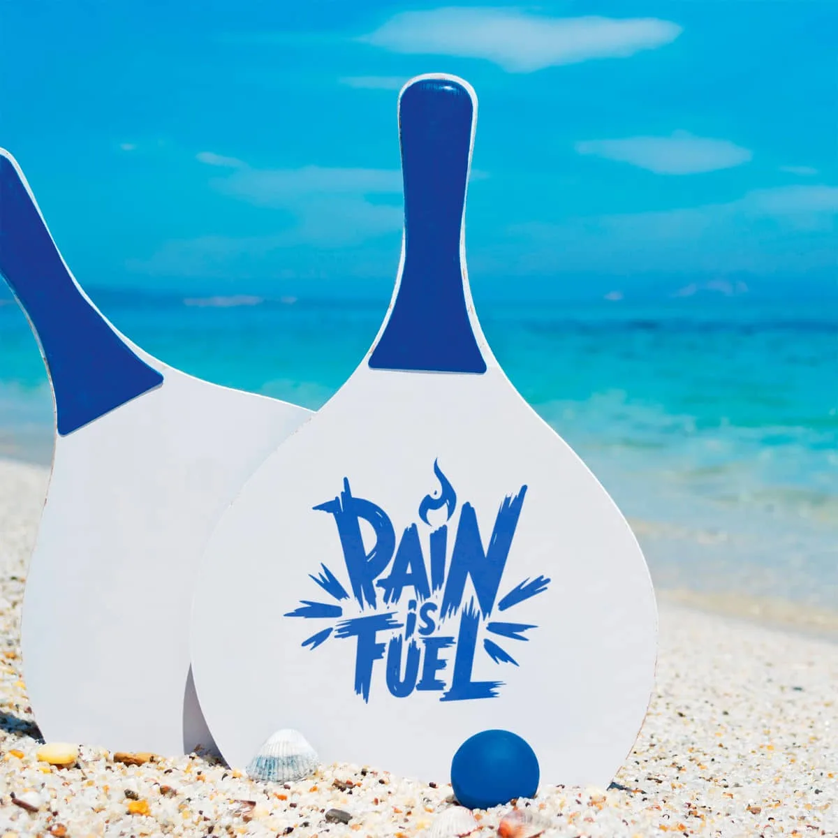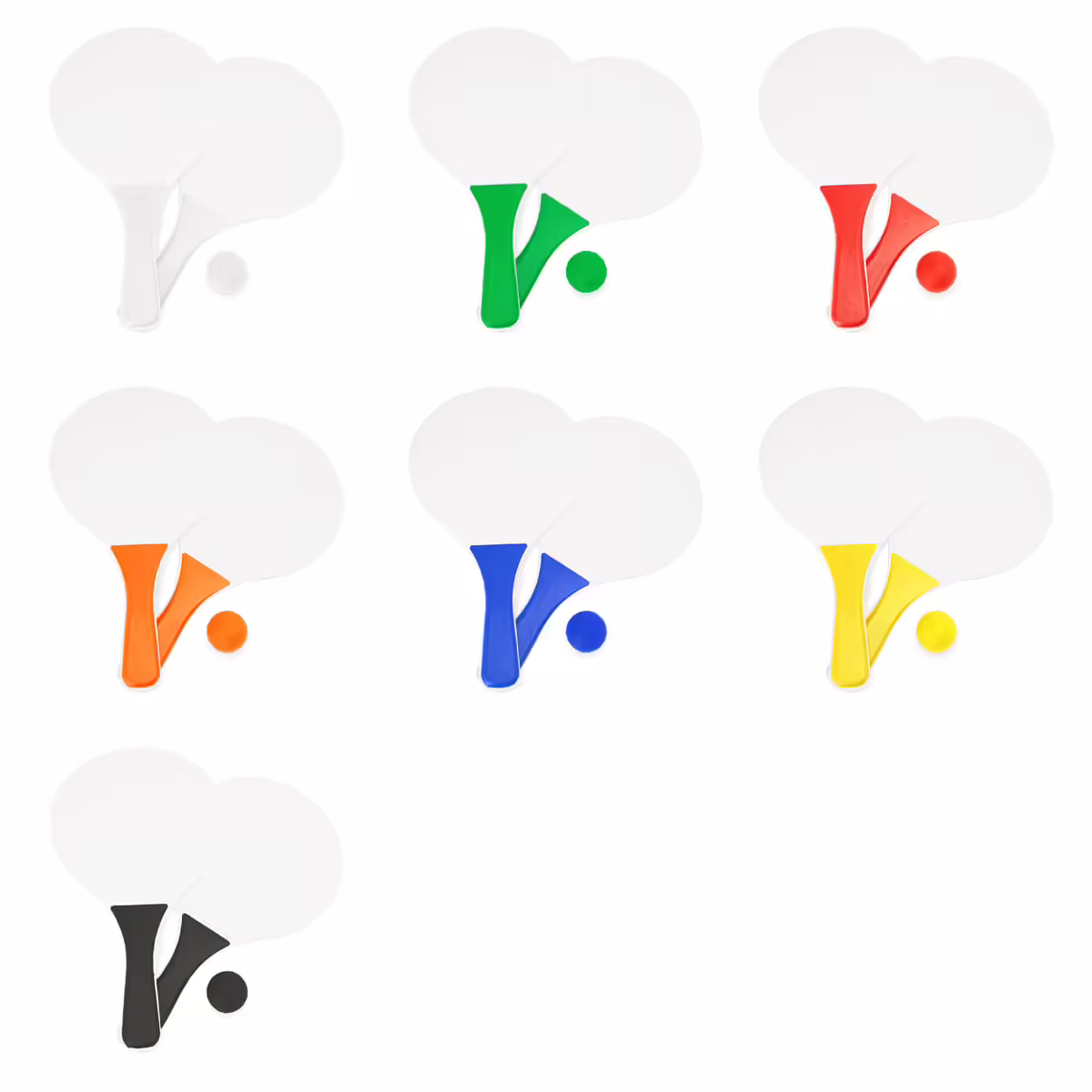 Un juego de dos palas de playa con una pelota. Mango en color, raqueta en blanco y pelota a juego con el mango. Presentación en bolsa tipo redecilla.
